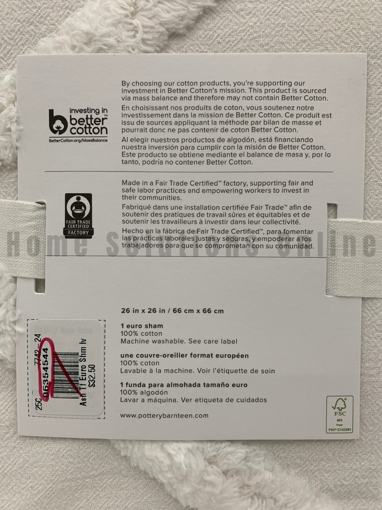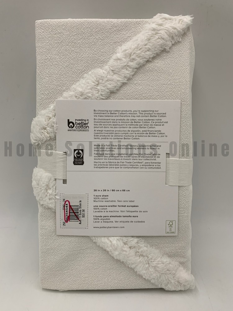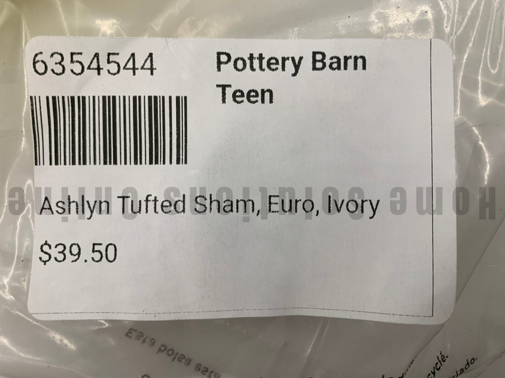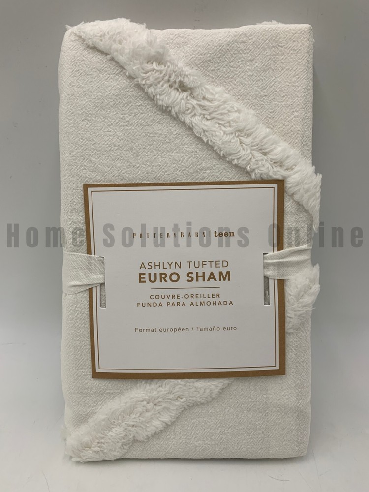 Pottery Barn Teen Ashlyn Tufted Cotton Sham Item is brand new Auction includes: 1 sham DIMENSIONS: Sham Standard: 26" wide x 20" high Euro : 26" square CARE AND MAINTENANCE: Machine wash in cold water; gentle cycle. Use only non-chlorine bleach, if needed. Tumble dry on low heat. Warm iron as needed. OVERVIEW: Made of 100% cotton. Duvet cover and sham reverse to a solid color. Duvet cover has interior ties and a hidden button closure to keep the duvet in place; sham has a flap closure. Duvet cover, shams and inserts sold separately . Machine wash. Imported.