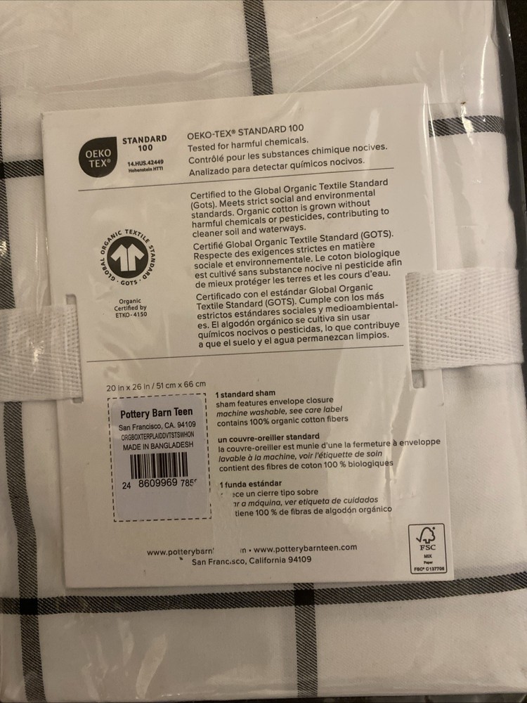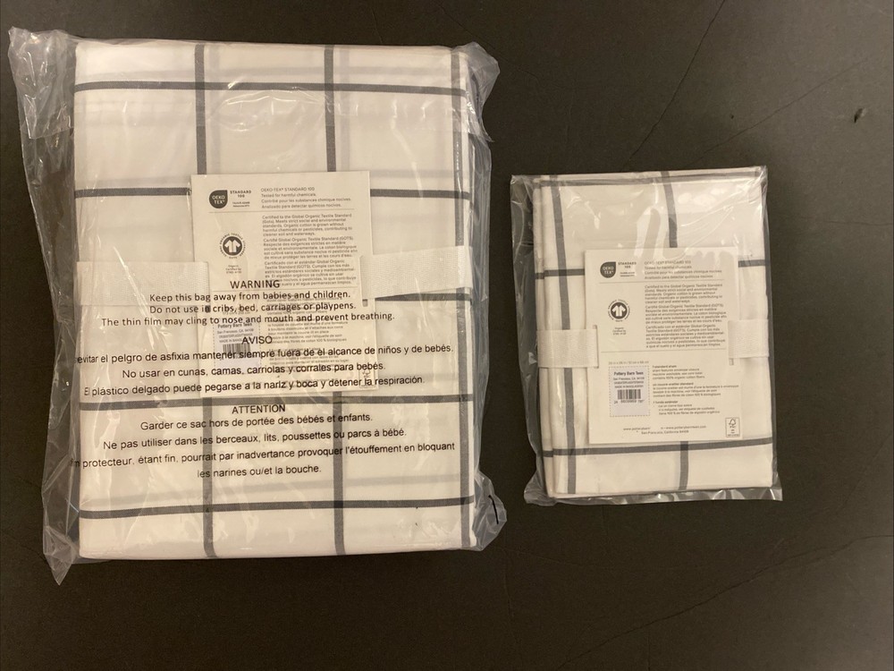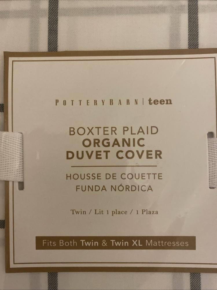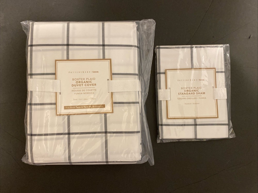 Wrap up your teen's bedroom in the fresh, crisp elegance of the Pottery Barn Teen Boxter Plaid Twin Duvet Cover Set. This two-piece set includes a rectangular twin-sized duvet cover, along with a coordinating sham, both adorned in a classic white and onyx plaid pattern that adds a touch of sophistication to any bedroom decor. Crafted from 100% cotton for ultimate comfort and breathability, this set promises ease of care with machine washable and tumble dry instructions. The duvet cover's high-quality construction is evident in its detailed stitching, ensuring it stands up to the daily demands of a bustling teen's space while maintaining its stylish appeal. New with tags MSRP: $130 for both