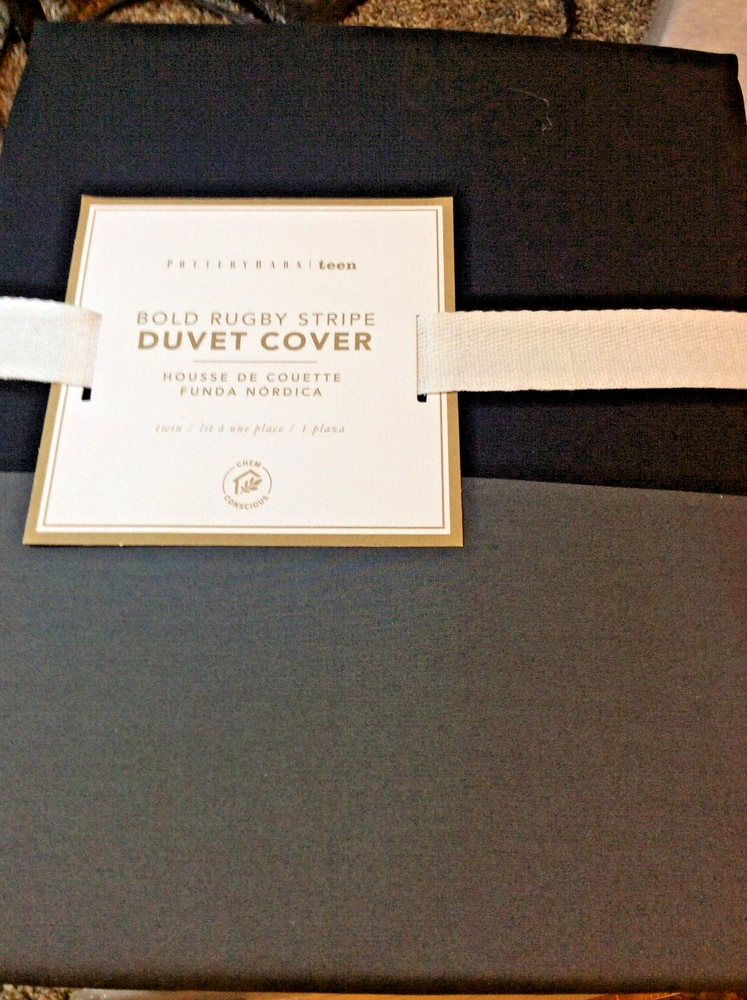 One Twin / XL Twin Size Duvet Cover by Pottery Barn Teen in the Rugby Bold Stripe Bedding Collection. Black & Gray Insnspired by sporty rugby jerseys, this Duvet Cover boasts bold stripes for a cool and stylish look. Woven from supersoft pure percale. Made of 100% cotton percale; a percale weave is noticeably denser and wears well over time. New with Tags Pet Free / Smoke Free