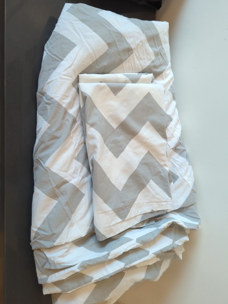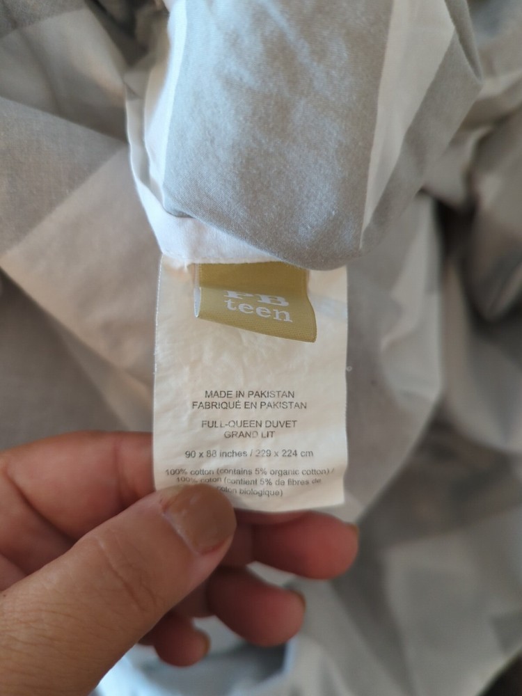 Add a touch of style to your bedroom with this Pottery Barn Teen Chevron Full Queen Duvet Cover & 2 Pillow Sham Zig-Zag K29. The set includes a duvet cover and two pillow shams, both made of 100% cotton material, in a beautiful white color with a stylish chevron pattern. The shams are reversible and feature a button closure type for easy removal and cleaning. Ideal for teens, this two-piece set is perfect for a bedroom with a full/queen size. The brand is Pottery Barn and the type is a duvet cover. It is perfect for any bedroom with a unique style and a comfortable fill material.
