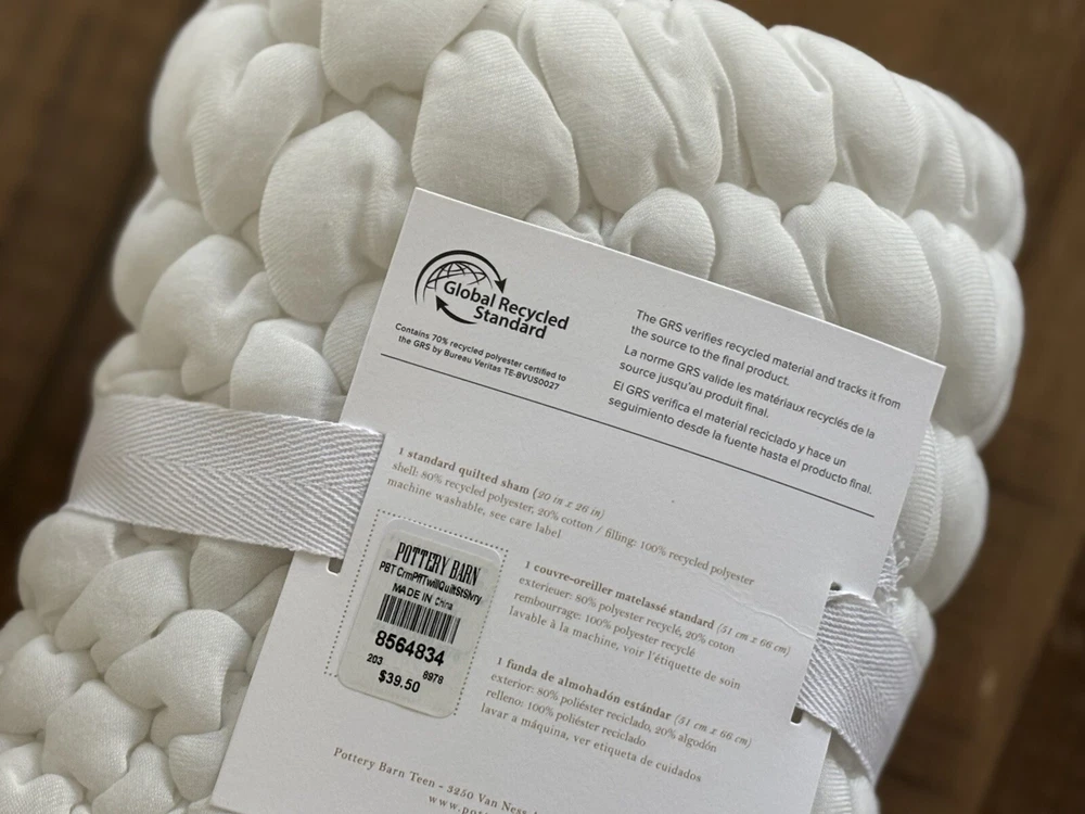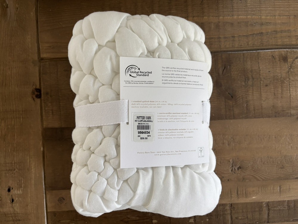 THIS INCLUDES 1 Standard Sham. Cream Puff Microfiber Sham Made of 80% recycled polyester and 20% cotton twill. The polyester in this quilt is made from over 45 recycled plastic bottles and the shams are made from 5 recycled plastic bottles Filled with 100% polyester. Sham reverse to a solid color. Quilted sham has a center opening. Sham inserts are sold separately. Machine wash. Imported.