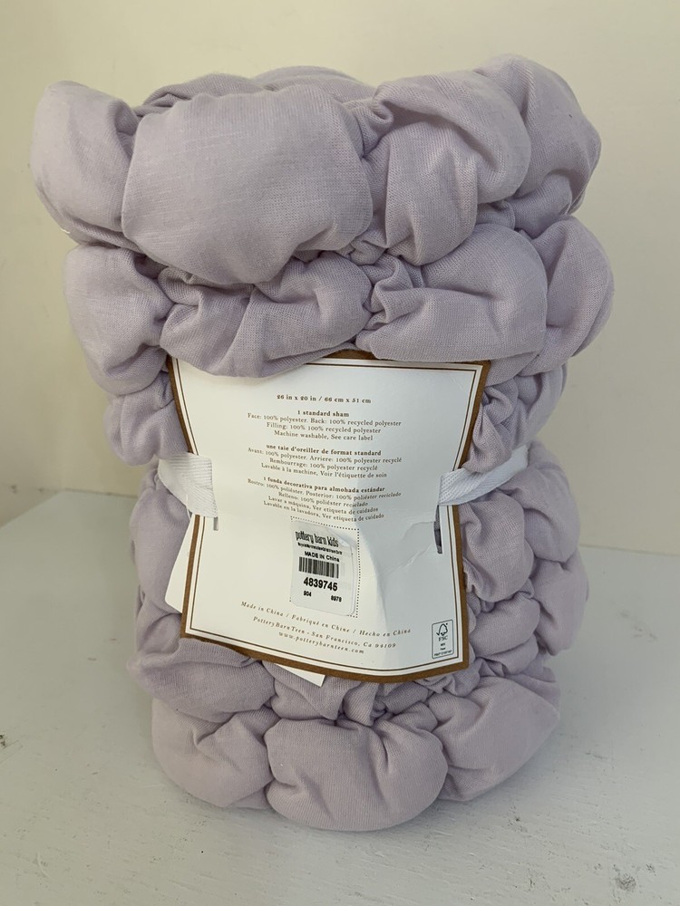 Add a touch of elegance to your bedroom with this Pottery Barn Cream Puff Recycled Quilted Standard Sham in dusty iris color. Made of a soft cotton blend material, it features a beautiful quilted design that seamlessly blends with any bedding style. Measuring 20 inches in length and 26 inches in width, this pillow sham fits perfectly on any standard-sized pillow. The dusty iris color adds a warm and cozy feel to your bedroom, making it the perfect addition to your home decor. Ideal for a bedroom, this pillow sham provides a comfortable and stylish touch to your bedding. Free shipping in the USA.