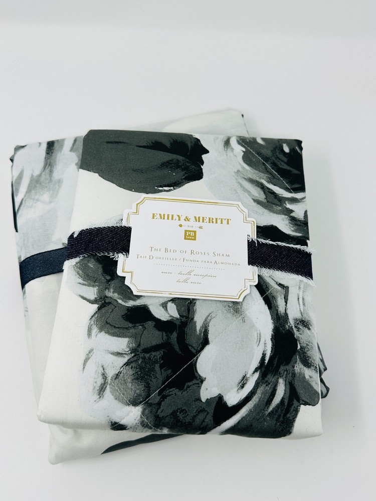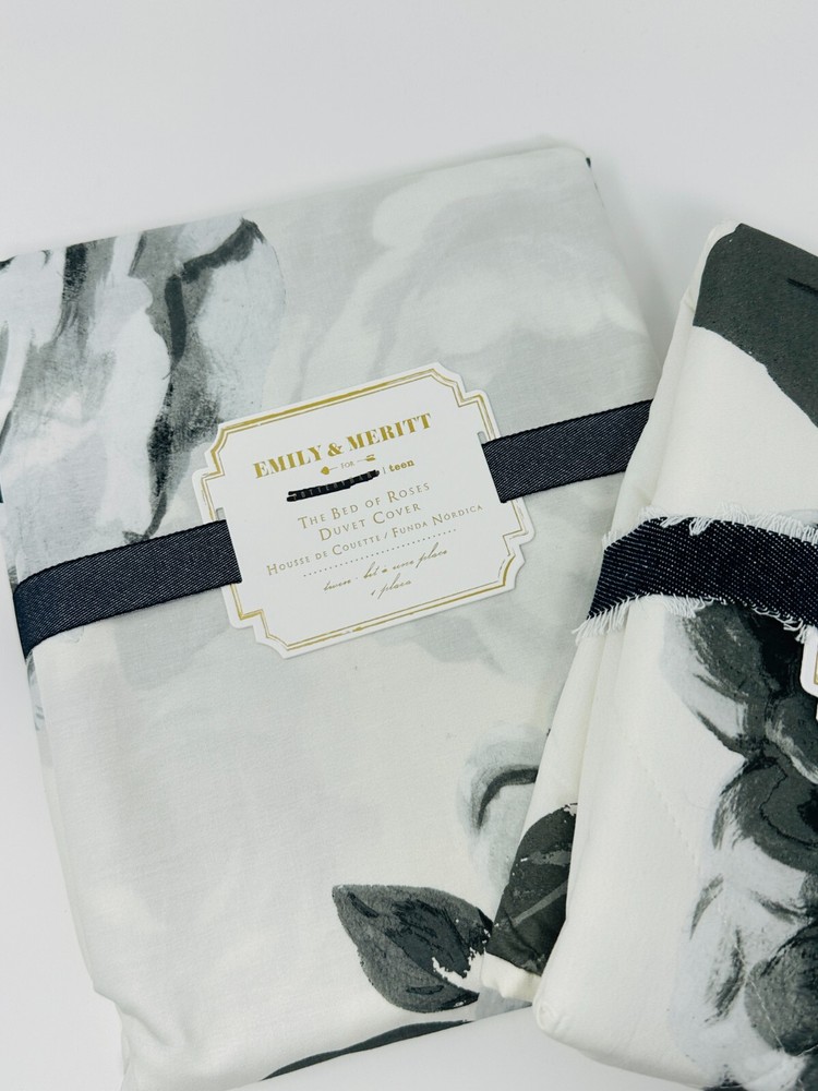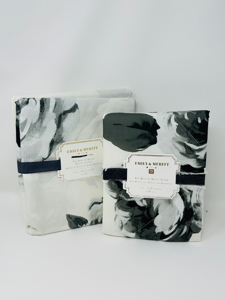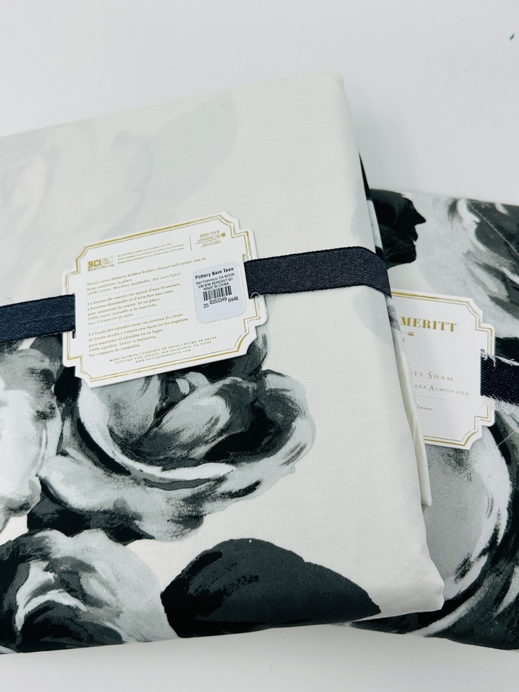 This is a Pottery Barn Teen Emily & Meritt Bed of Roses Twin Duvet Cover and Euro Sham set. The duvet cover and sham feature a rose pattern in multicolor, made from 100% cotton. This white with black roses style is described as Romantic, and the set includes both the duvet cover and euro sham. The product is designed for Pottery Barn Teen.