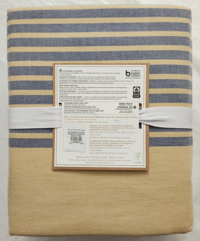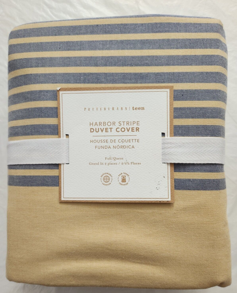 New with Tags, as Shown in Photos. Add a touch of summer style to your bedroom with this Pottery Barn Teen Harbor Stripe Duvet Cover. The rectangular cover is made of 100% cotton and features a classic navy and golden yellow striped pattern. Perfect for a Harbor Stripe themed room. The full/queen size measures 90" x 88" and comes with buttons for easy closure. Machine washable for convenient care. Pottery Barn Teen Harbor Stripe Bedding collection and is ideal for teens who want to add a stylish touch to their bedroom. The one-piece set includes the duvet cover and is perfect for those who love the Harbor Stripe character family.
