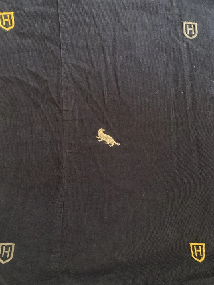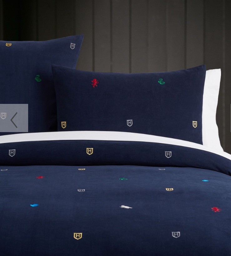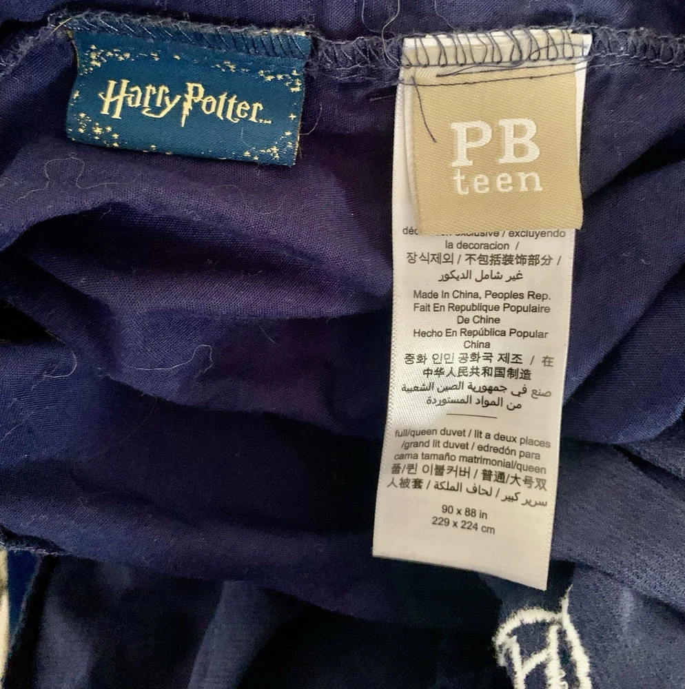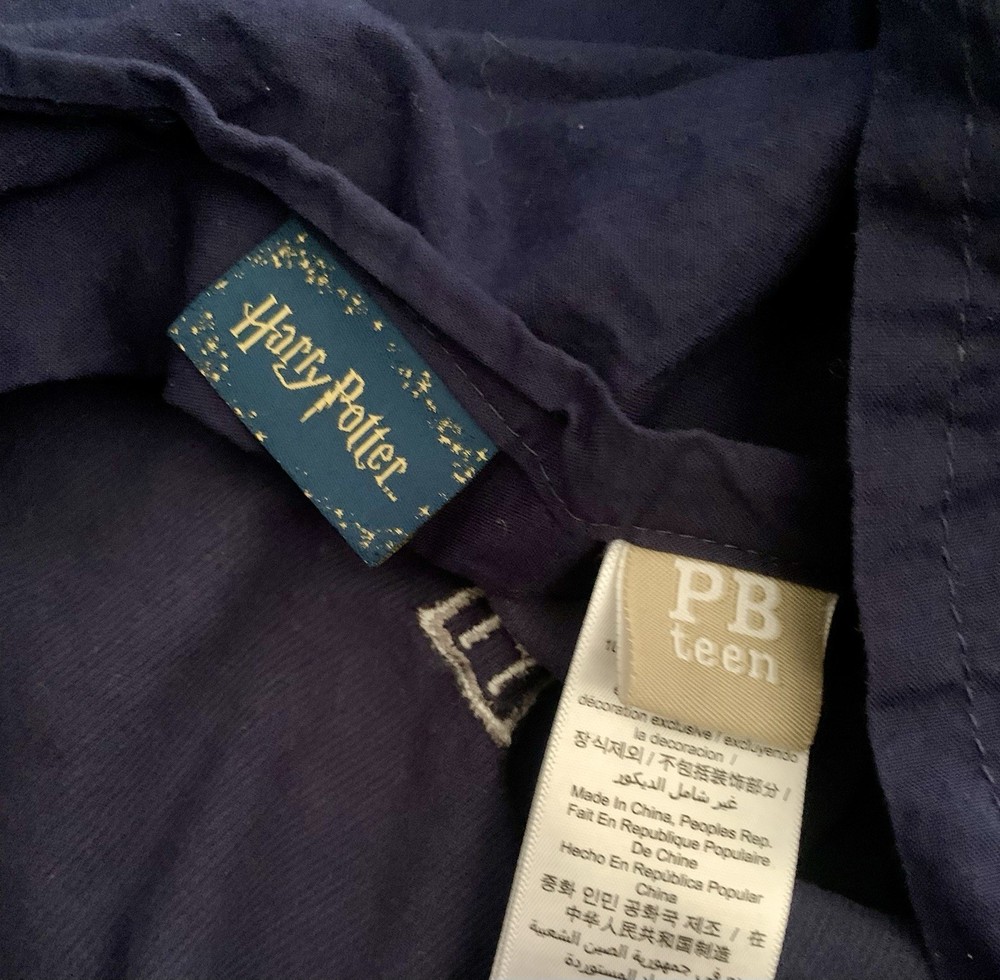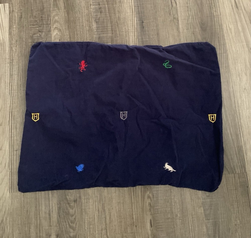 Harry Potter Hogwarts House Duvet Cover + Sham It represents all four Hogwarts houses: Gryffindor, Slytherin, Hufflepuff, and Ravenclaw. The set is made from pure cotton corduroy and percale. It features the Hogwarts crest and house emblems on a dark gray background. The duvet cover has interior ties and a button closure, while the sham has an overlap closure. in Full/Queen size. The material is soft, comfortable, and machine washable. It is part of the Pottery Barn Harry Potter collection Preowned Check out last picture 1 button missing but can be 🚩🚩🚩🚩replaced . Hard to find sold out Ships usps ground advantage shipping