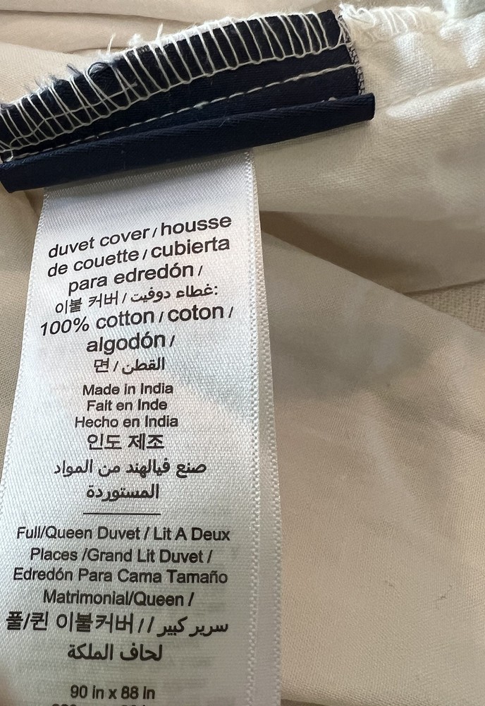 New but has one small snag shown in pictures Made of 100% cotton. Yarn-dyed fiber has incredibly rich color that holds its vibrancy over time. Duvet cover has interior ties and a button closure.