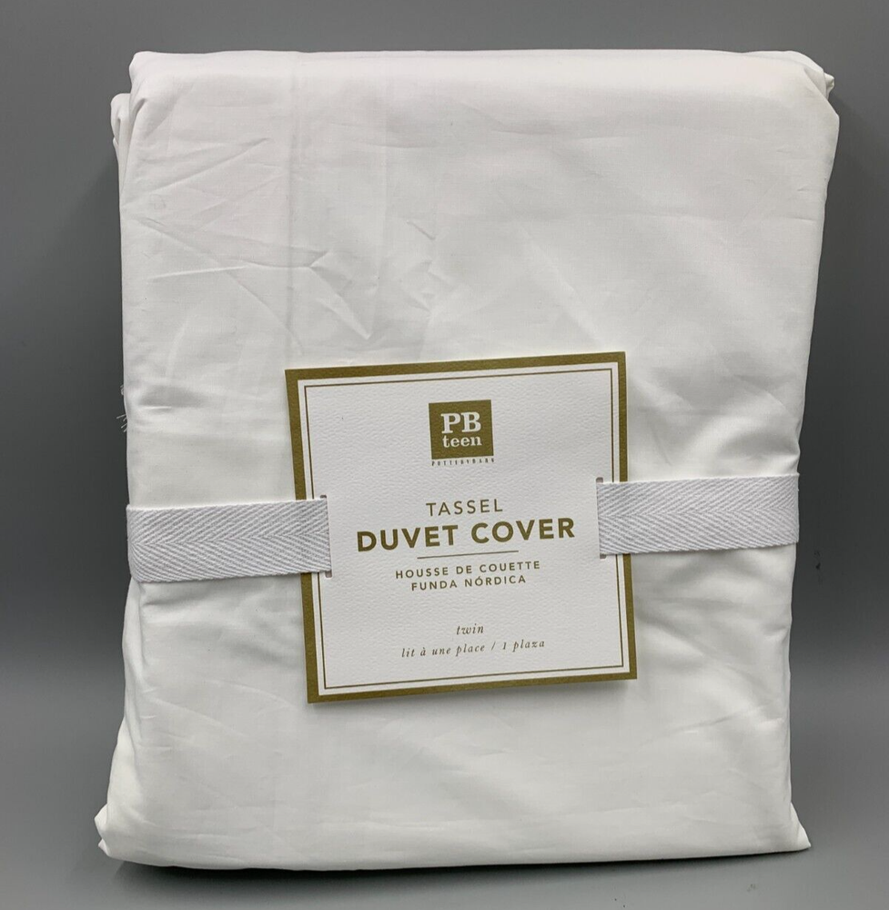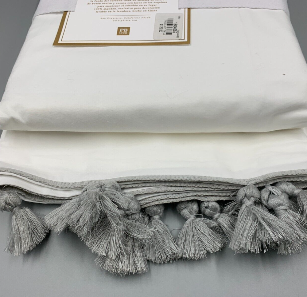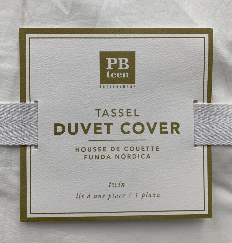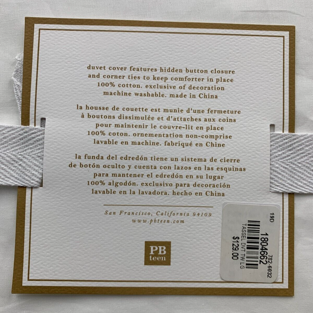 Pottery Barn Teen Kids Girls Tassel Duvet Cover - Twin XL Twin Item is brand new Auction includes: 1 duvet cover DIMENSIONS: Duvet Cover Twin/Twin XL : 68" wide x 86" long Full/Queen: 90" wide x 88" long Sham Standard: 26" wide x 20" high Euro: 26" square CARE AND MAINTENANCE: Machine wash in cold water; gentle cycle. Tumble dry on low heat. OVERVIEW Made from 100% cotton. Twin-sized duvet cover fits both standard twin and twin XL dorm mattresses. Duvet cover and shams reverse to a solid color. Duvet cover has interior ties and a hidden button closure; sham has an envelope closure. 200-thread count. Duvet cover & sham sold separately or as a set; pillow and duvet insert sold separately. Machine wash. Imported.