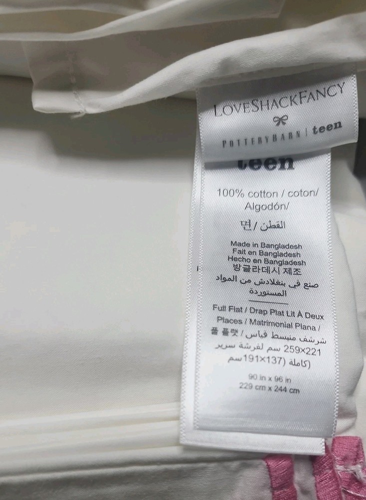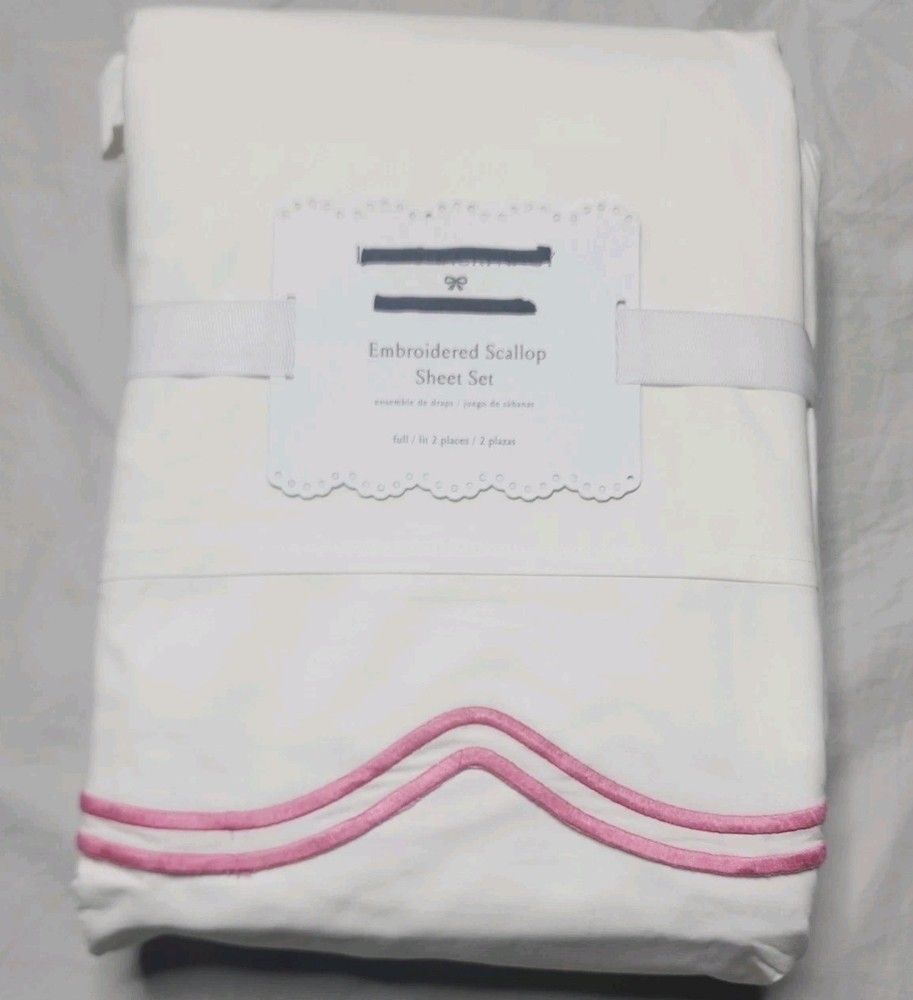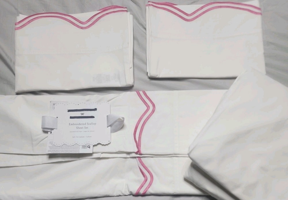 The Pottery Barn Teen LoveShackFancy Embroidered Scallop Sheet Set in Full size features a modern design in pink and ivory colors. Made of 100% cotton, this set includes embroidered scalloped edges for added style. Perfect for teens, girls, or kids, this sheet set is easy to care for with machine wash and tumble dry instructions. Ideal for a bedroom setting, this set of 4 adds a touch of elegance and comfort to any space.