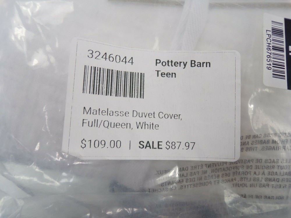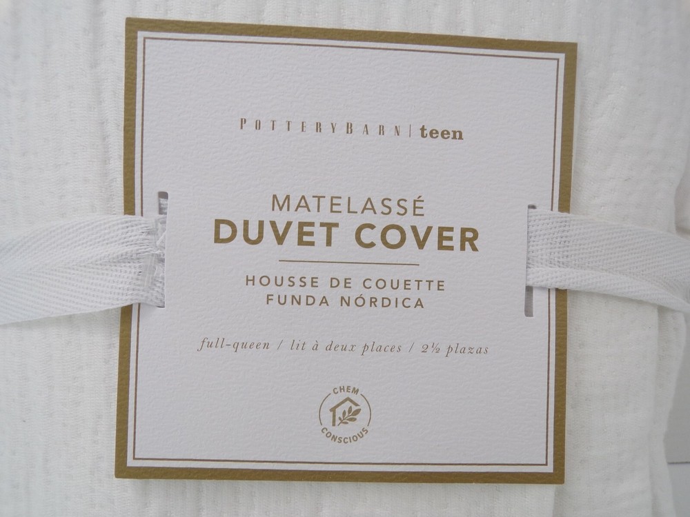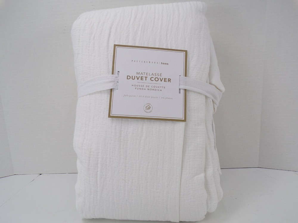 Pottery Barn Teen Matelasse Duvet Cover Full Queen White Item is brand new! Auction includes: 1 Duvet Cover The superfine yarns are spun from cotton blend for a perfect balance of breathability and softness. STANDARD 100 by OEKO-TEX® certified – tested against a list of over 350 harmful substances. Made of 70% cotton and 30% polyester; reverses to 100% cotton. 144-thread count. Duvet cover reverses to a solid color. Duvet cover has interior ties and a hidden button closure. Machine wash. Imported. DIMENSIONS Duvet Cover Twin/Twin XL: 68" wide x 86" long Full/Queen: 90" wide x 88" long CARE AND MAINTENANCE Machine wash in warm water. Use only non-chlorine bleach, if needed. Tumble dry. Warm iron as needed.