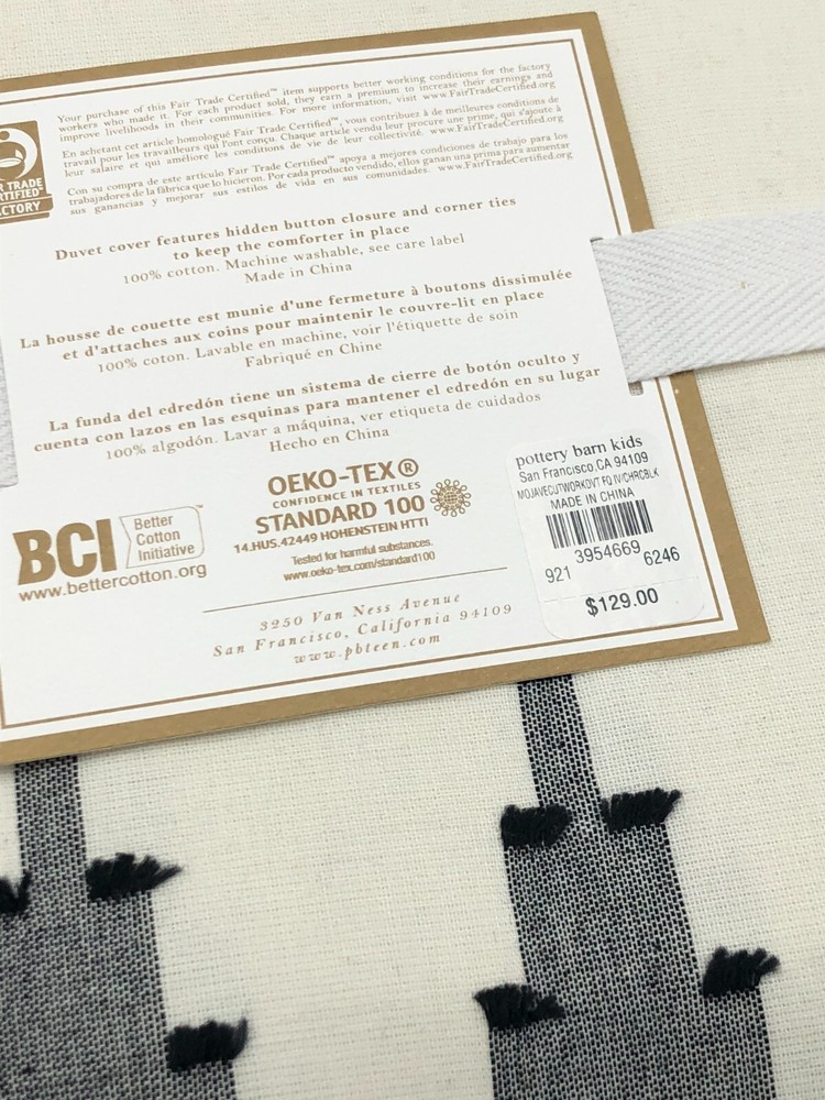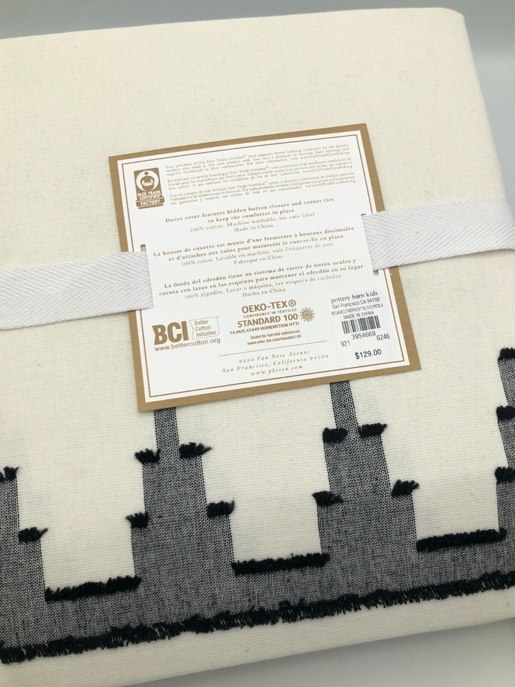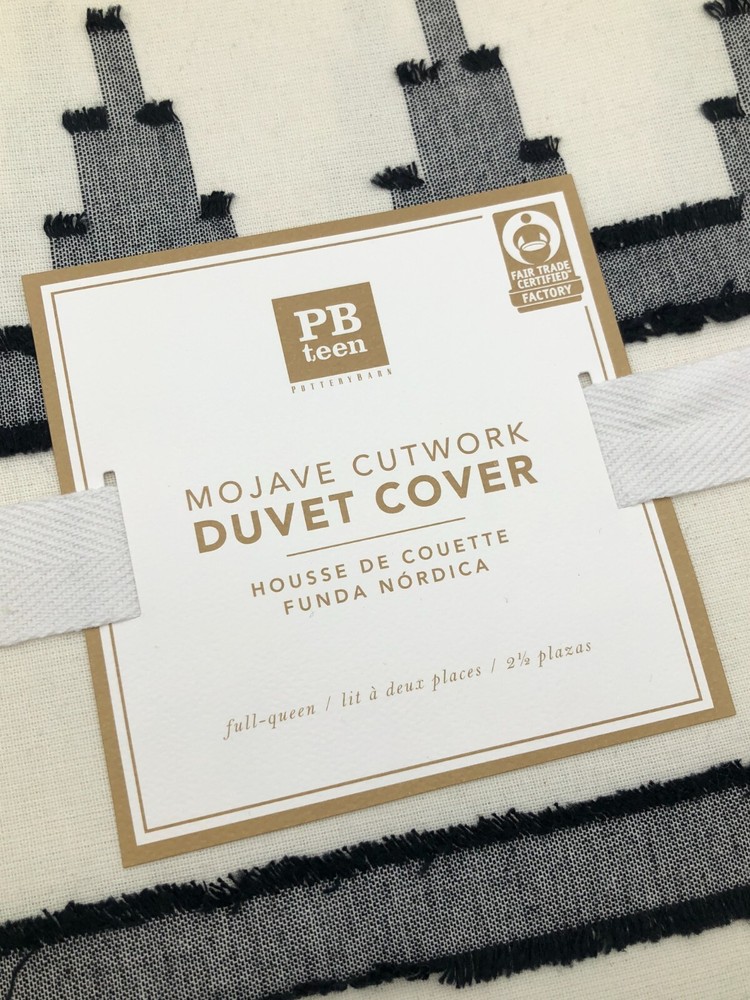 This is a Pottery Barn Teen duvet cover in size Full/Queen. It features a Mojave cutwork design in cream and charcoal colors. Made of 100% cotton, this duvet cover set includes the duvet cover only. Ideal for teens, this bedding piece adds a stylish touch to any bedroom decor.