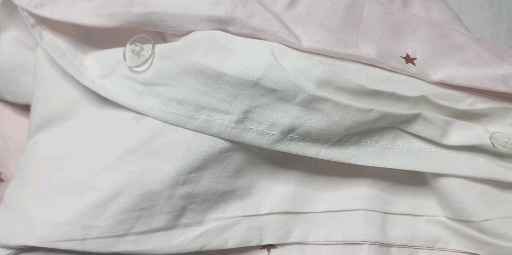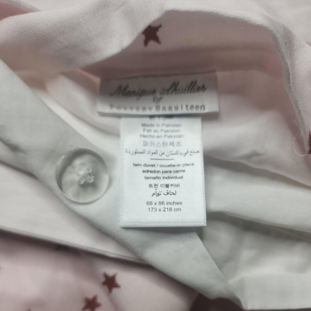 The Pottery Barn Teen Monique Lhuillier Metallic Stardust Duvet Cover Set for XL Twin beds features a beautiful pink color with a star pattern, creating a magical and retro-inspired theme perfect for teens' bedrooms. Made from 100% cotton, this duvet cover is machine washable and includes a button closure for easy maintenance. With dimensions of 86" length and 68" width, this duvet cover adds a touch of whimsy to any bedroom while providing a comfortable and stylish addition to home decor.