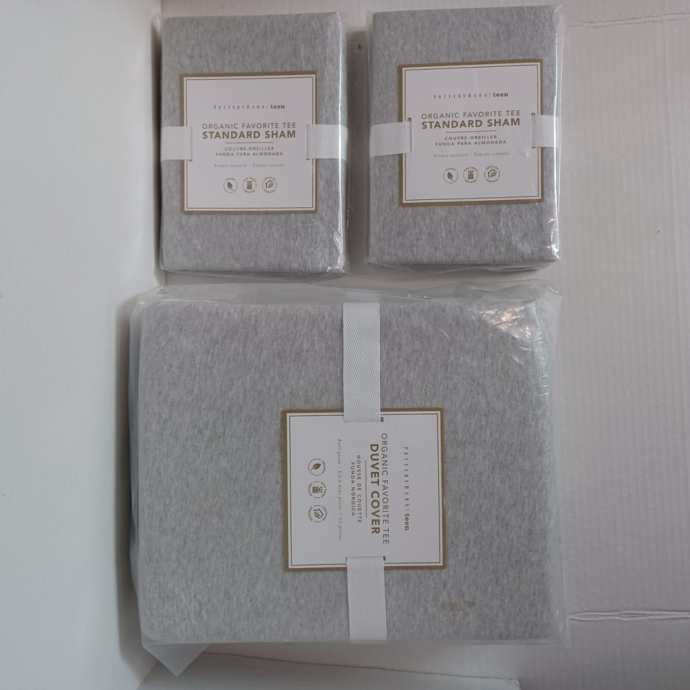 Listing is for 1 Organic Favorite Tee Full Queen Duvet Cover & 2 Standard Shams from Pottery Barn Teen, new in package as pictured. Color is Heathered Light Gray, please view online photos for accurate colors, shades and pattern. Exterior packaging may be torn, taped or cut. The only item in this listing is 1 full queen duvet cover and 2 standard shams, no inserts or other items are included. PBT says: Made from soft knitted jersey and designed to brighten your dorm, this duvet cover is a must-have for making your home-away-from-home perfectly yours. Full/Queen: 90" wide x 88" long Made of organic knitted heather jersey. Duvet cover and sham reverse to same. Duvet cover has interior ties and a hidden button closure to keep the duvet in place; sham has an envelope closure. Machine wash. Imported. In the interest of fair trade I do my best to accurately describe my items. I value my feedback and will promptly correct any mistakes due to an inaccurate item description. Returns are accepted within 14 days provided item is returned unopened with all original packaging. Returns are subject to a 20% restocking fee. Buyer pays return shipping costs. Pottery Barn, Williams-Sonoma and West Elm items are from Pottery Barn and Williams-Sonoma retail stores, catalog and outlets and may be overstock, clearance or catalog returns and as such the internal tag and/or the exterior packaging may be missing or marked through. This in no way affects the functionality of the item unless stated otherwise in the listing. Items are inspected prior to listing and again at time of shipment and anything noted is included in the item description. I am not affiliated with Pottery Barn/Williams Sonoma. My items come from a smoke-free home. The free shipping quoted is for the lower 48; AK, HI, PR, USVI and Canada please email for shipping quote prior to purchasing. Most items ship within 24 hours of confirmed payment.