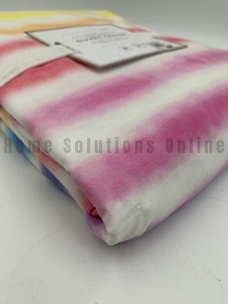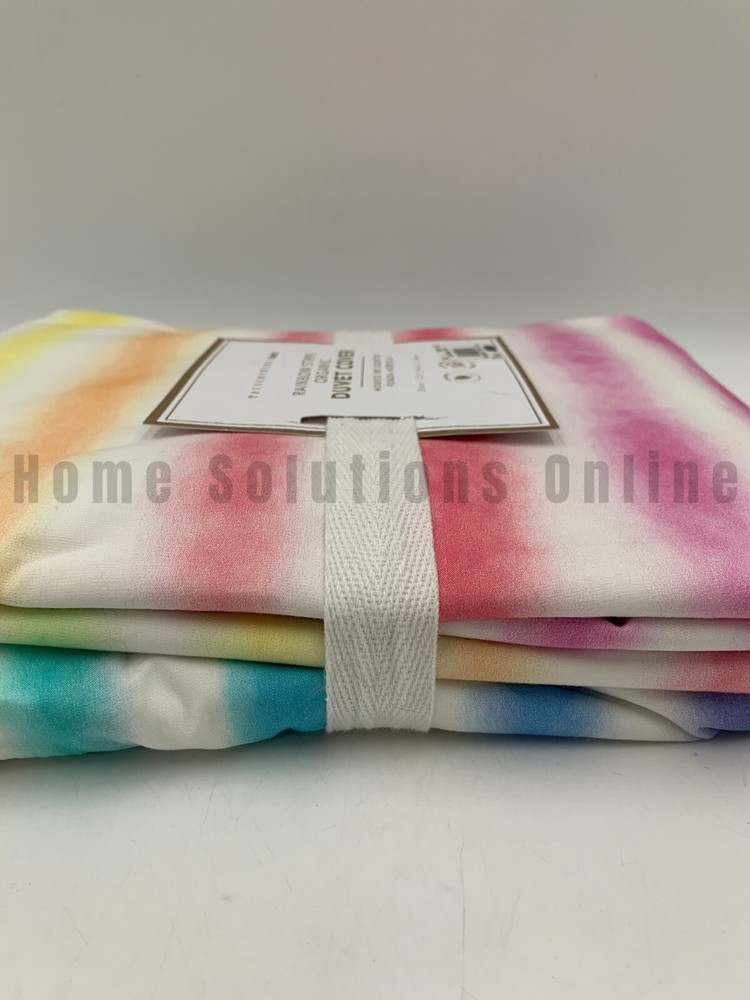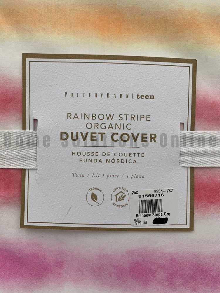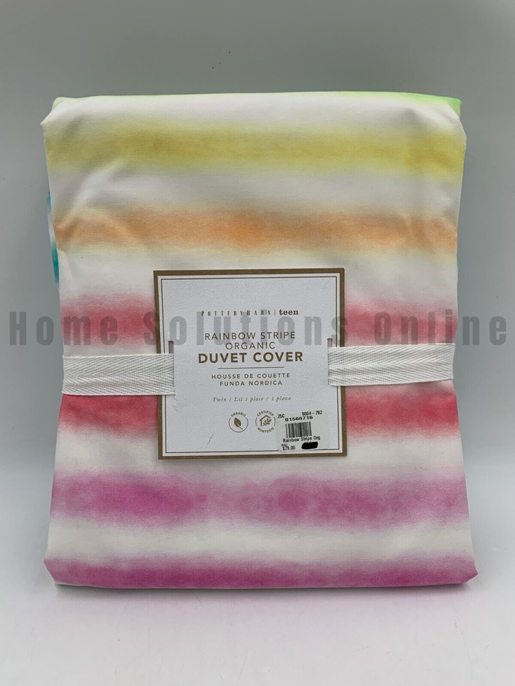 Pottery Barn Teen Rainbow Stripe Organic Percale Duvet Cover PLEASE NOTE: This is different than the Kayla Stripe Duvet Cover. This is the RAINBOW STRIPE Duvet Cover. Item is brand new Auction includes: 1 duvet cover DIMENSIONS: Duvet Cover Twin/Twin XL : 68" wide x 86" long Full/Queen: 90" wide x 88" long Sham Standard: 26" wide x 20" high CARE AND MAINTENANCE: Machine wash in warm water. Only non-chlorine bleach when needed. Tumble dry. Warm iron as needed.