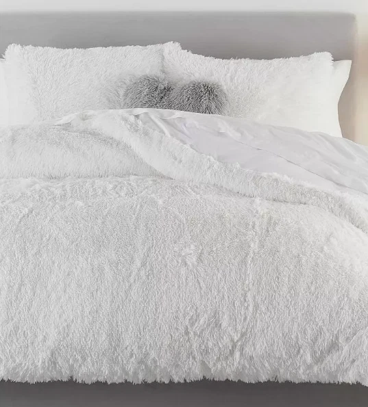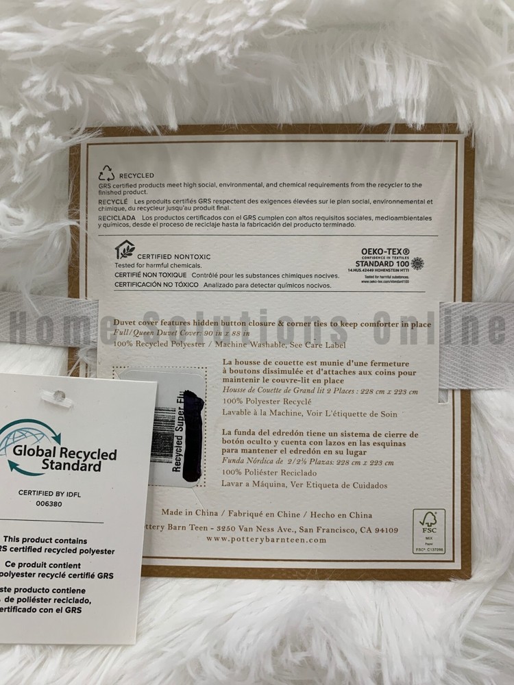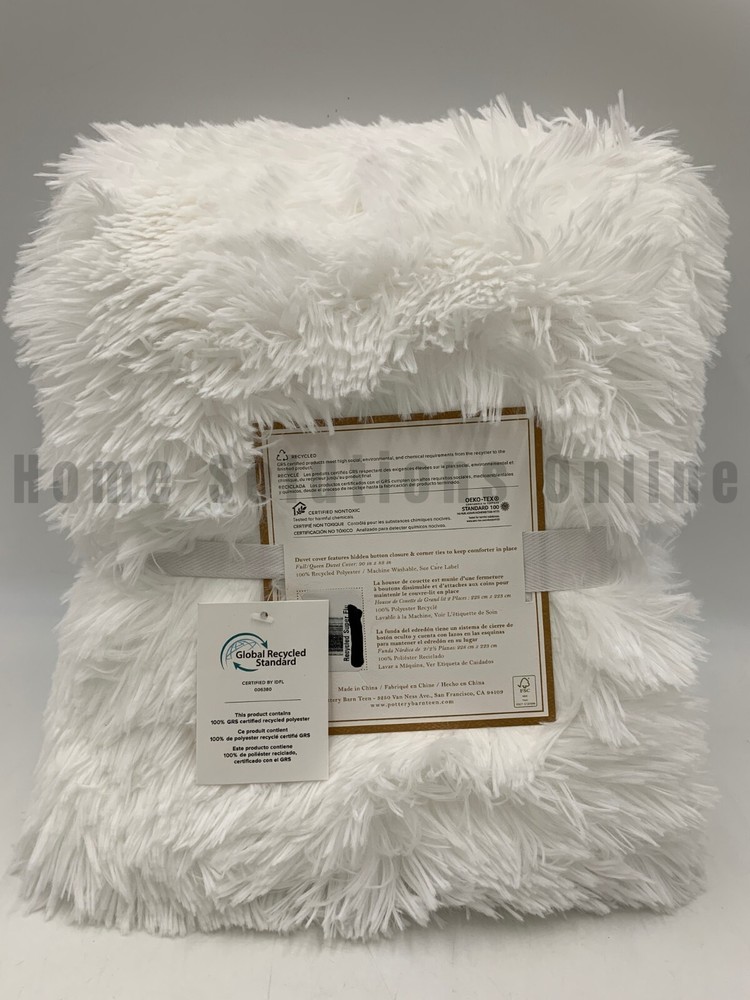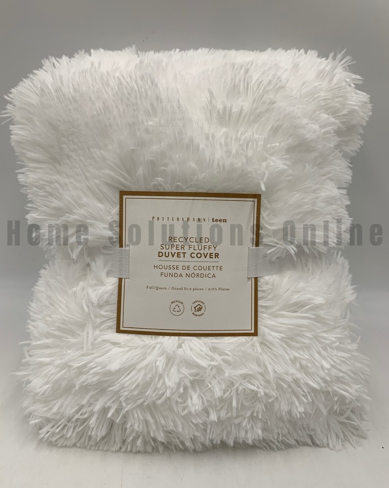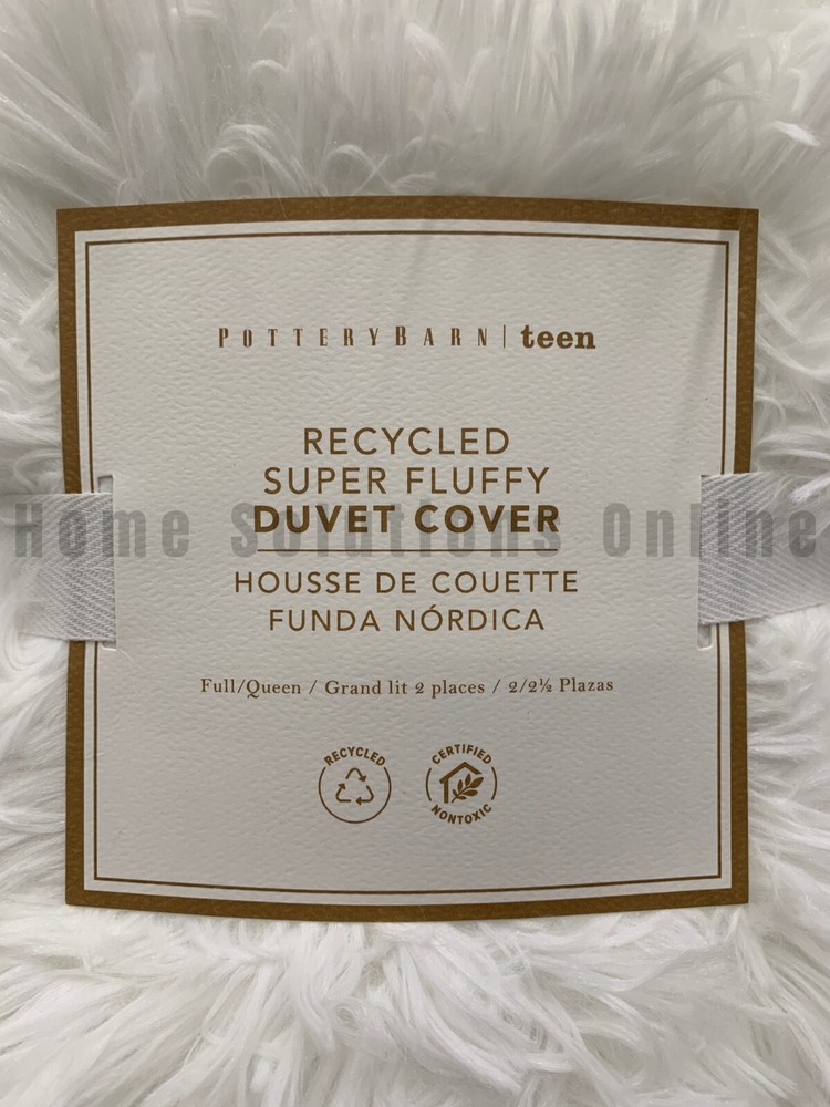 Pottery Barn Teen Recycled Super Fluffy Faux Fur Duvet Cover Item is brand new Auction includes: 1 duvet cover DIMENSIONS: Duvet Cover Twin/Twin XL: 68" wide x 86" long Full/Queen : 88" wide x 90" long Sham Standard: 26" wide x 20" high CARE AND MAINTENANCE: Machine wash in cold water; gentle cycle. Use only non-chlorine bleach, if needed. Tumble dry on low heat. Do not iron.