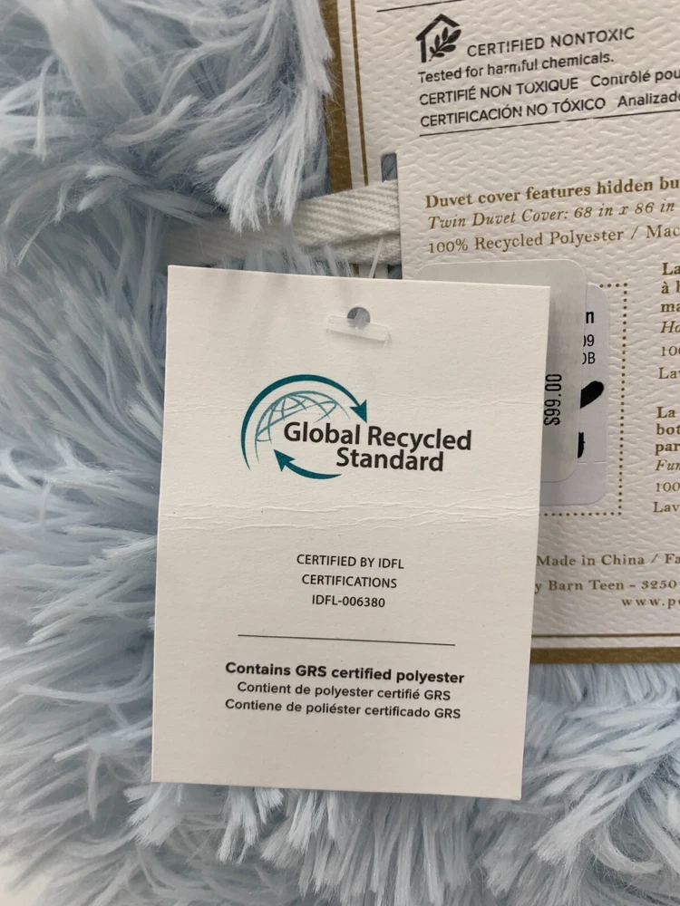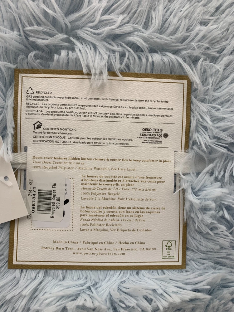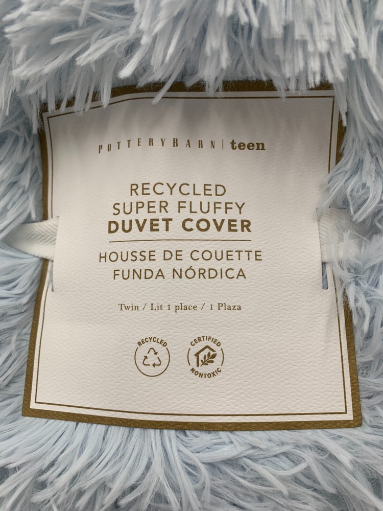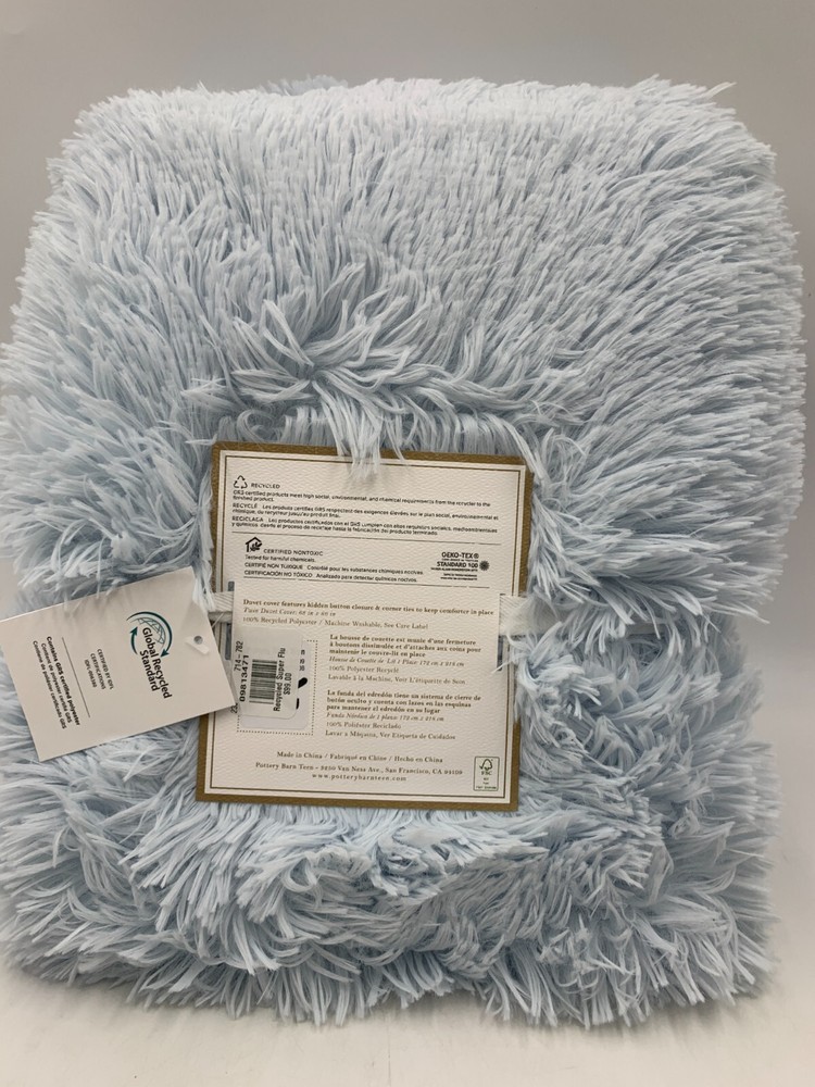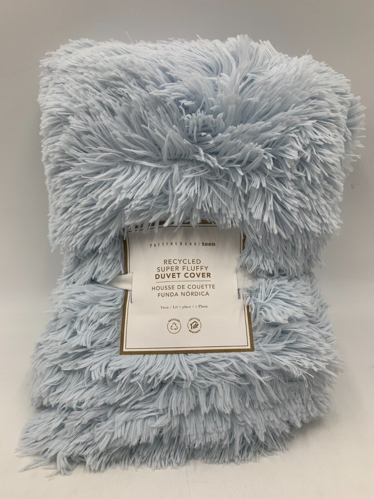 Pottery Barn Teen Recycled Super Fluffy Faux Fur Duvet Cover Item is brand new Auction includes: 1 duvet cover DIMENSIONS: Duvet Cover Twin/Twin XL : 68" wide x 86" long Full/Queen: 88" wide x 90" long Sham Standard: 26" wide x 20" high CARE AND MAINTENANCE: Machine wash in cold water; gentle cycle. Use only non-chlorine bleach, if needed. Tumble dry on low heat. Do not iron.