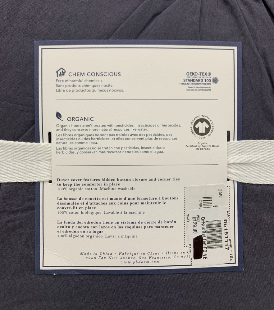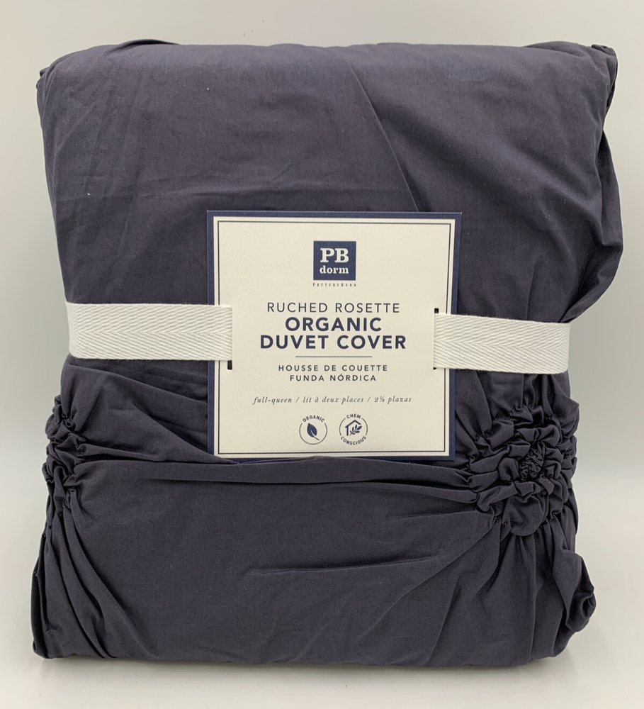 Pottery Barn Teen Ruched Rosette Organic Duvet Cover Item is brand new Auction includes: 1 duvet cover DIMENSIONS: Duvet Cover Twin/Twin XL: 68" wide x 86" long Full/Queen : 90" wide x 88" long Sham Standard: 26" wide x 20" high CARE AND MAINTENANCE: Machine wash in warm water, gentle cycle. Use only non-chlorine bleach, if needed. Tumble dry on low heat; remove promptly. Warm iron if needed.