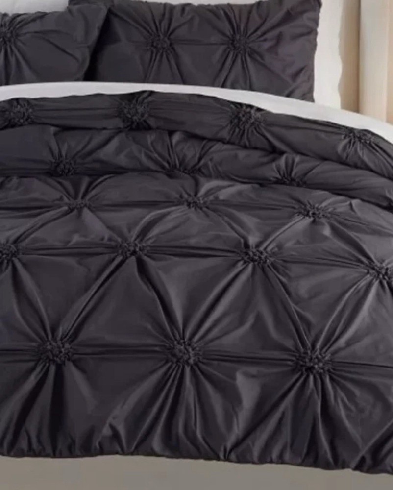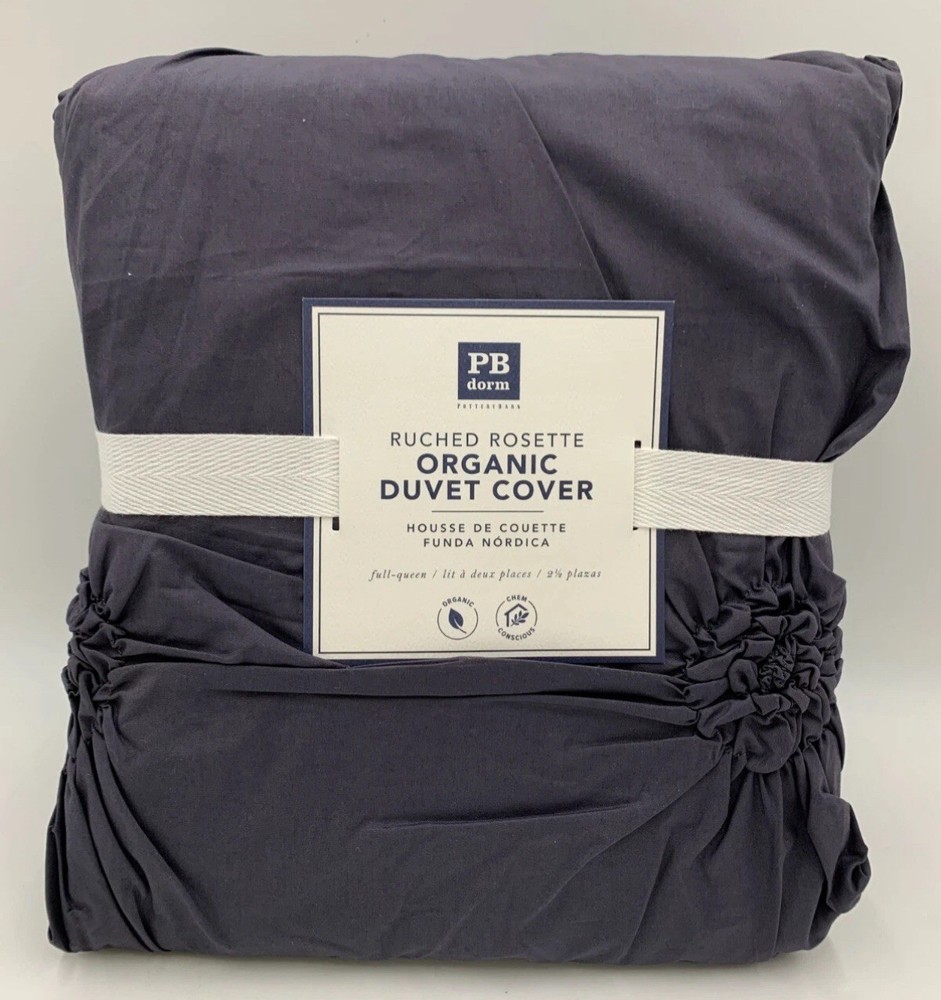 Add a touch of elegance and comfort to your bedroom with the Pottery Barn Teen Ruched Rosette Duvet Cover. Vintage Ebony color scheme paired with a modern floral pattern creates a chic, inviting atmosphere. Designed to fit a full queen bed, this duvet cover is made from premium organic cotton, ensuring a soft and sustainable sleep experience. The duvet cover features a stylish rectangular shape and a convenient button closure for easy washing. Ideal for teens, adults, and kids alike, it brings a chic, contemporary flair to any bedroom. Proudly crafted in China, this 100% cotton duvet cover is a perfect blend of luxury and practicality.