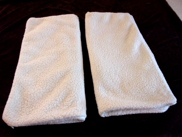 Pair of great sherpa fleece shams. Fabric same front and back with zippered closures. Euro--each measures 26" x 26". Fabric content not listed. Heavier weight poly blend? Very good used condition.