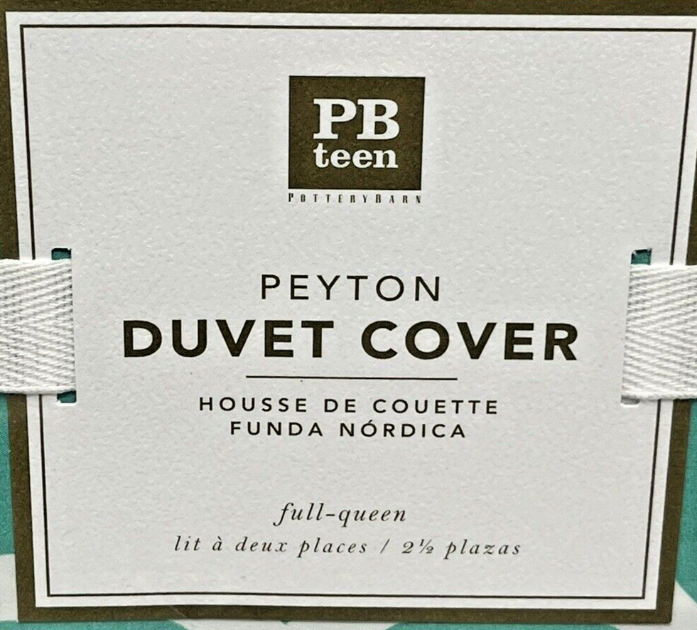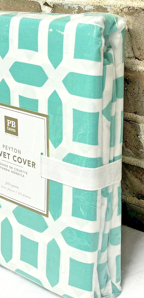Brand New In The Package Retired Pattern You get 1 Duvet Cover Only Full / Queen Size Retails for $99.00 + tax, so getting a good deal here Add a touch of modern style to your bedroom with this Pottery Barn Teal Aqua Peyton Geometric Duvet Cover. Made of 100% cotton, this duvet cover is machine washable and tumble dryable for easy maintenance. The abstract pattern in a beautiful Teal Aqua green color adds a pop of color to your room. This full queen duvet cover features a button closure and is perfect for teens, adults, and kids. It is a great addition to any bedroom decor and is sure to impress your guests. Get this stylish and comfortable duvet cover today!