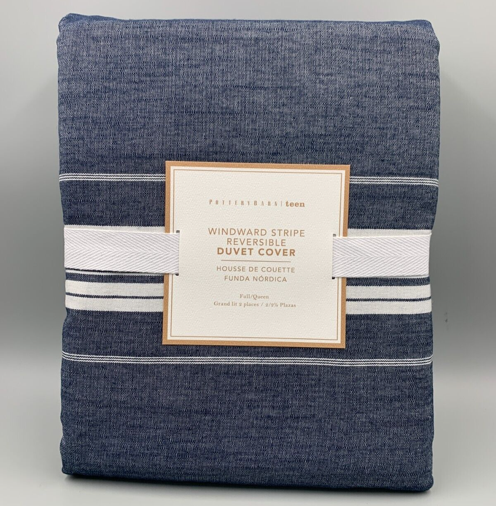 Pottery Barn Teen Windward Stripe Reversible Duvet Cover Item is brand new Auction includes: 1 duvet cover DIMENSIONS: Duvet Cover Twin: 68" wide x 86" long Full/Queen : 90" wide x 88" long King/Cal King: 108" wide x 92" long Sham Standard: 26" wide x 20" high Euro: 26" square CARE AND MAINTENANCE: Machine wash in cold water; gentle cycle. Use only non-chlorine bleach, if needed. Tumble dry on low heat. Warm iron as needed.