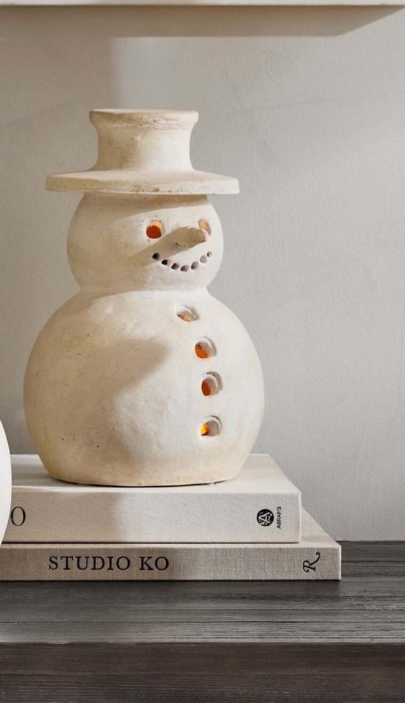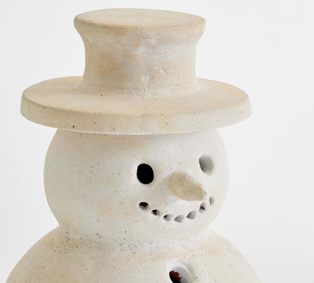 Pottery Barn Terracotta Snowman Luminary Small 11.5 H Christmas New CONSTRUCTION Handcrafted of Red clay with a painted Matte glazed finish. Imported. CARE Clean with soft, dry cloth. Do not use solvents or abrasive cleaners. OVERALL: 7.75" diam, 11.5" h BASE: 6" diam