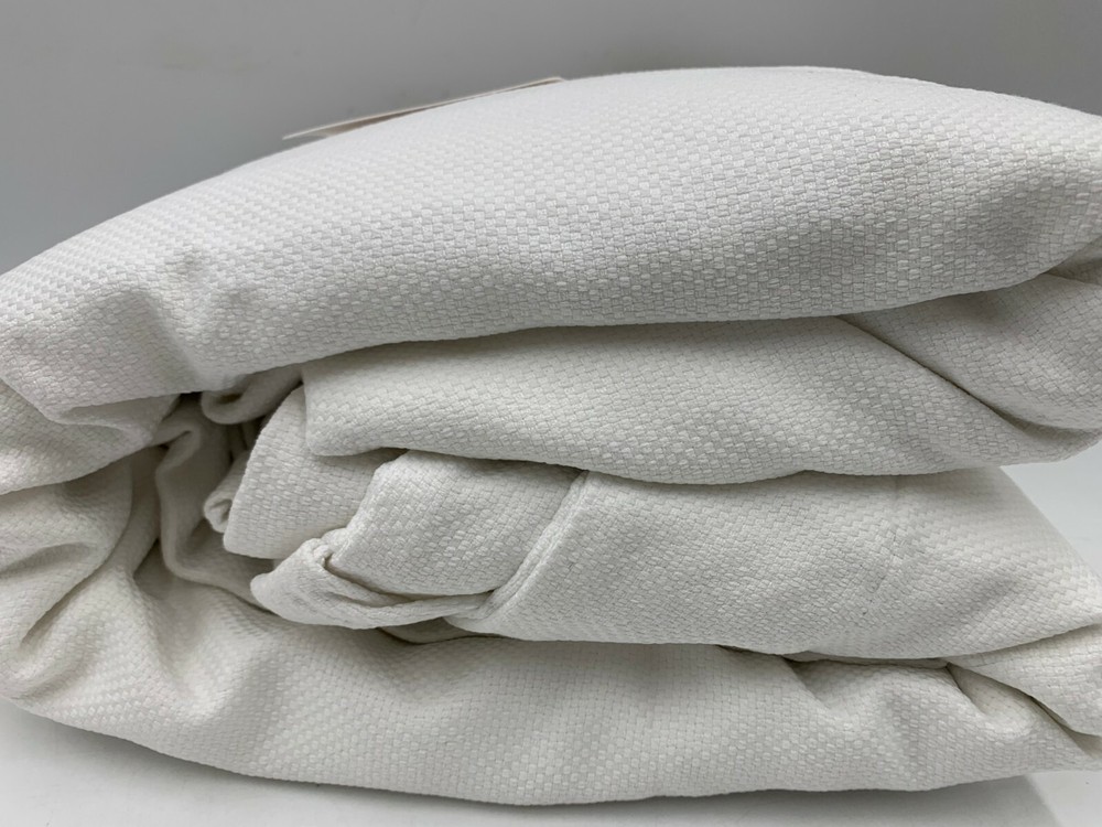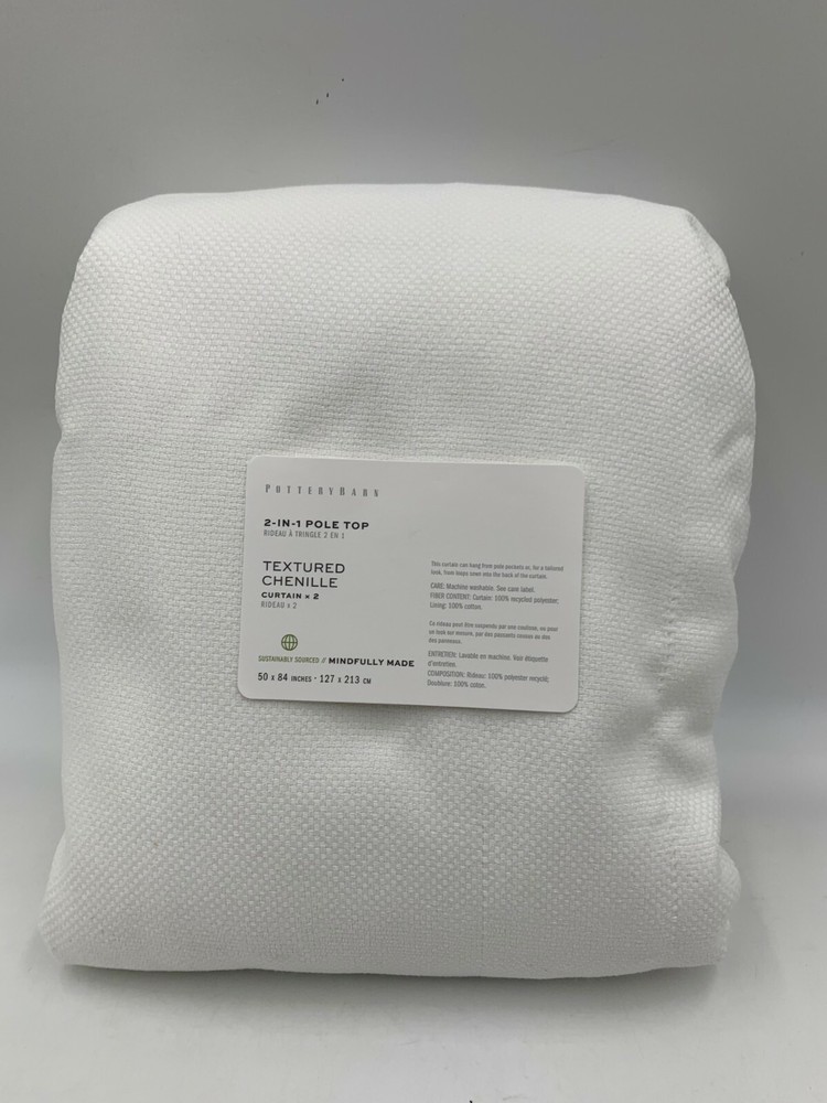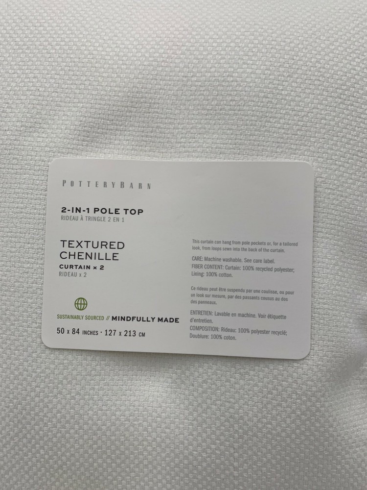 Pottery Barn Textured Chenille Cotton Lined Curtains Panels White 50x84" Set of 2 Items are brand new! Auction includes: 2 - 50x84" Panels - For one complete window Retails for over $129.00, does not include shipping fees or taxes! Woven of 100% GRS recycled polyester. Lined with 100% cotton in white. Curtain’s 3-in-1 construction offers three hanging options: rod pocket, back tabs, ring top. Made in a Fair Trade Certified™ factory Machine wash. Set of 2 panels. Imported. DIMENSIONS Length includes height of rod pocket. 50" wide x 84" long 50" wide x 96" long 50" wide x 108" long Side Hem: 1" wide Bottom Hem: 4" high rod pocket: 3" high CARE AND MAINTENANCE Machine wash in cold water; gentle cycle. Use only non-chlorine bleach when needed. Tumble dry on low heat; remove promptly. Warm iron as needed. Can also be dry cleaned.