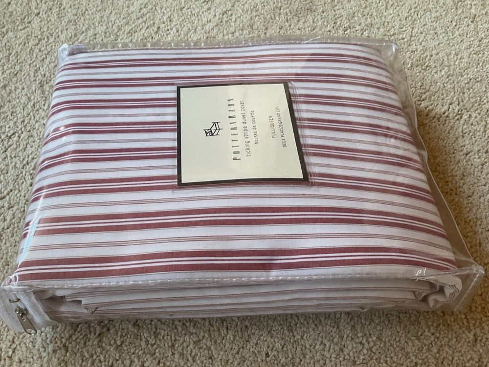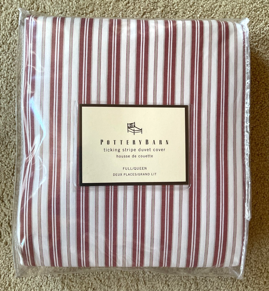 Pottery Barn Ticking Stripe Red/White Full/Queen Duvet Cover Vintage in unopened original packaging. Red and white ticking stripes, with very pale and subtle thin green stripes too. This versatile and charming style goes with cottage, farmhouse, rustic, traditional, or minimalist decor. Measuring 92 inches in length and 88 inches in width, this duvet cover fits a full or queen-sized bed. On package label: 100% cotton Machine washable. Tumble dry. Fits mattresses up to 18 inches deep. Made in Portugal for Pottery Barn.