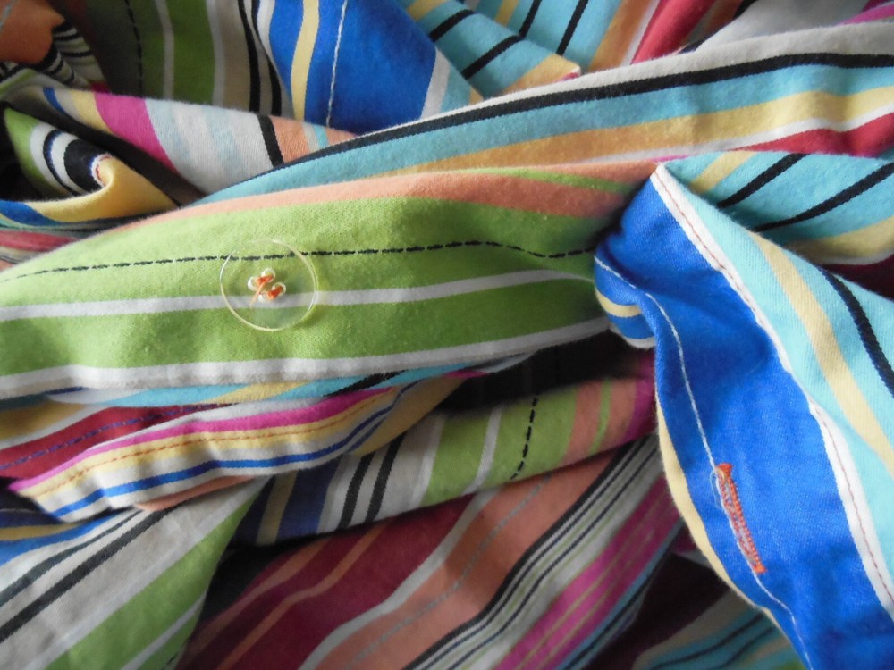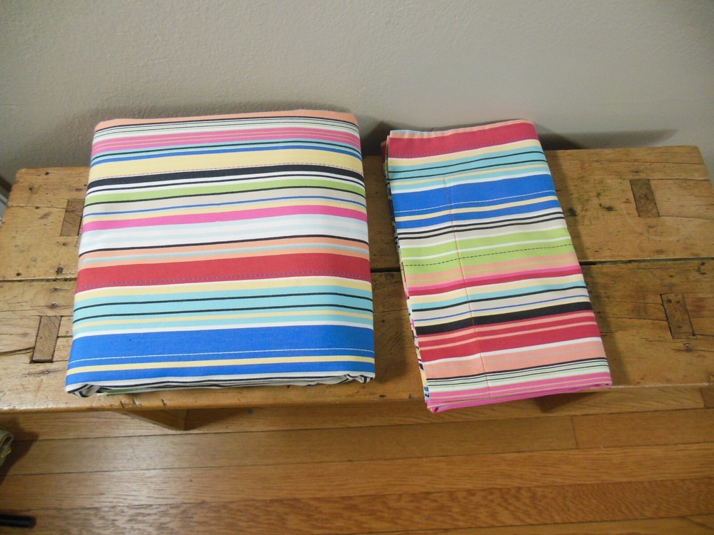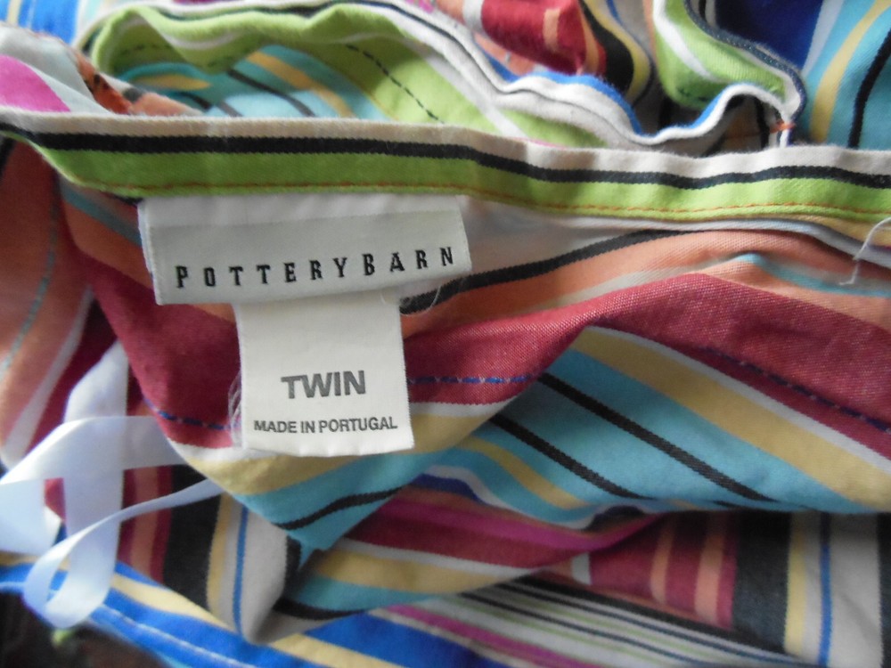 This is a brightly colored cotton stripe Pottery Barn twin duvet cover and standard pillow sham. Good condition with no holes or apparent stains. One clear button has been replaced with a similar clear button. Duvet cover has button closure on one end. Standard sham has flap opening on one end of back side. Freshly laundered and lightly pressed. Pottery Barn label attached.