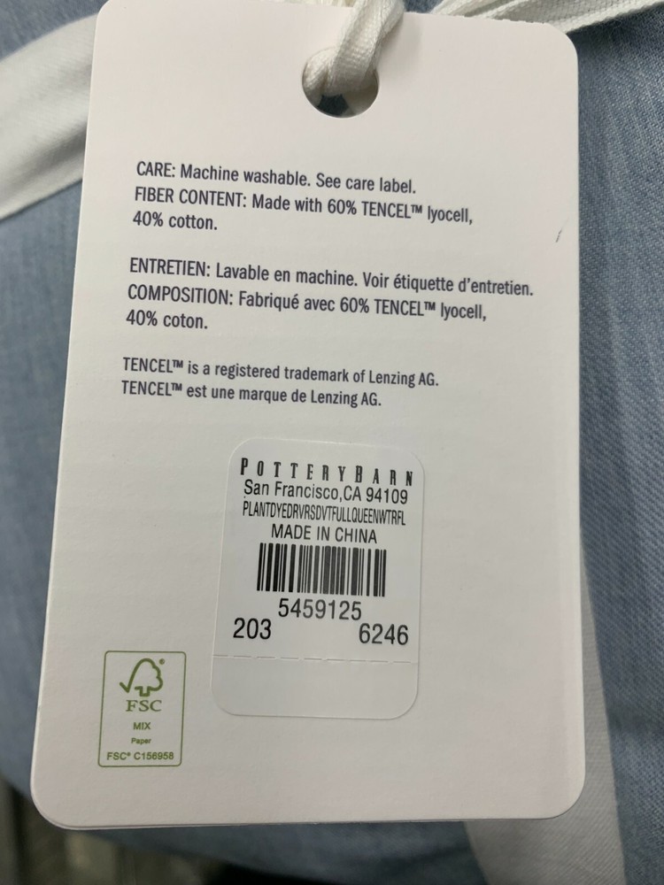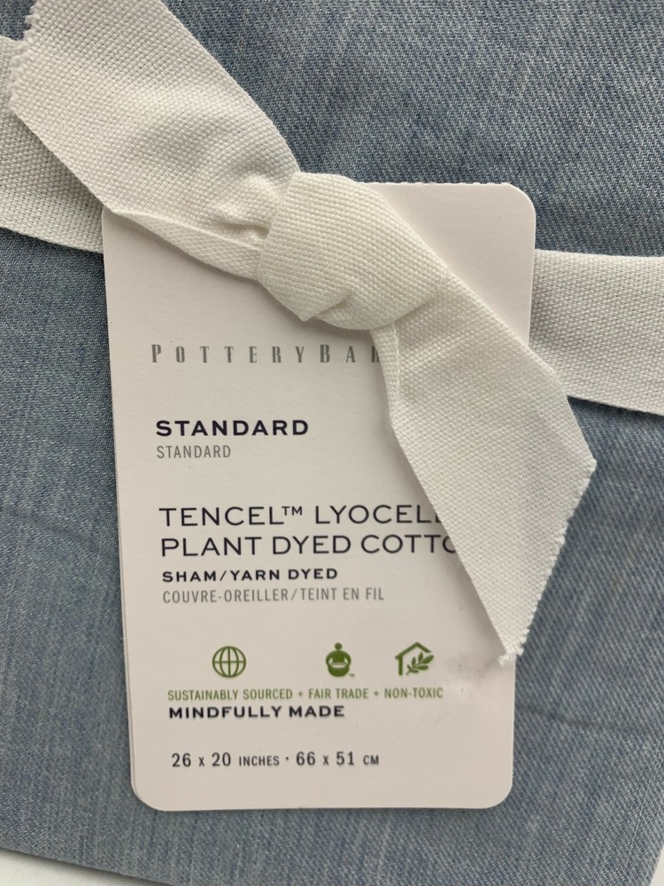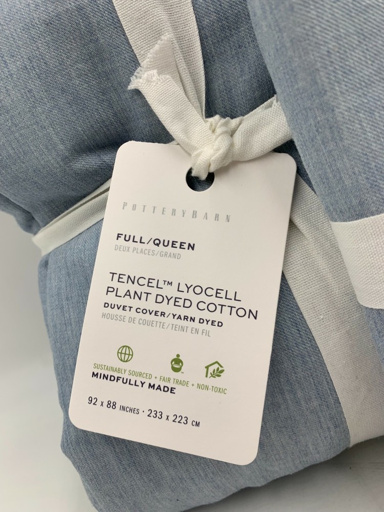Pottery Barn Ultra Soft Tencel Lyocell Duvet Queen w1 Sham Waterfall Blue #L42 Item is brand new! Auction includes: 1 Duvet Cover and 1 Standard Sham. Made from 60% Lyocell and 40% cotton. TENCEL™ is a Lyocell fiber sourced from responsibly managed forests. It is made through a sustainable, closed-loop process that recaptures 99% of all waste. Duvet reverses to same. Duvet features a hidden button closure with inner ties that keep insert in place Machine wash. Imported. DIMENSIONS Duvet Cover Full/Queen: 88" l x 92" w Sham Standard: 20" h x 26" w Flange: 2" CARE AND MAINTENANCE Machine wash in cold water; gentle cycle. Only non-chlorine bleach when needed. Tumble dry on low heat; remove promptly. Warm iron as needed.