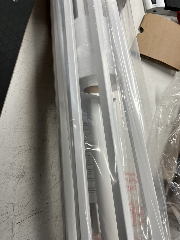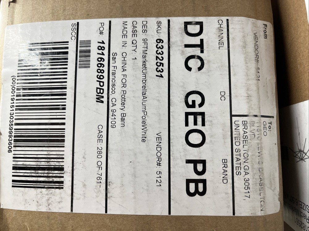 You are purchasing one Pottery Barn 9 ft Round Umbrella frame in white (frame only) frame color is white as shown in the stock photo. tilt frame. Finial included but not the black stand shown in the stock photo. I have several canopies in my store if you are looking for one to fit this frame. If a canopy and frame are purchased together the shipping amount for the canopy will be refunded. new in box. pb name marked out on the box. Size is 9 ft diameterShape is round OVERALL: 9' diam, 8.5' h POLE: 1.5" diam CLEARANCE FROM GROUND TO BOTTOM OF CANOPY: 74" (open), 38.25" (closed) FINIAL: 2.5" diam, 4" h WEIGHT: 17.5 lbs