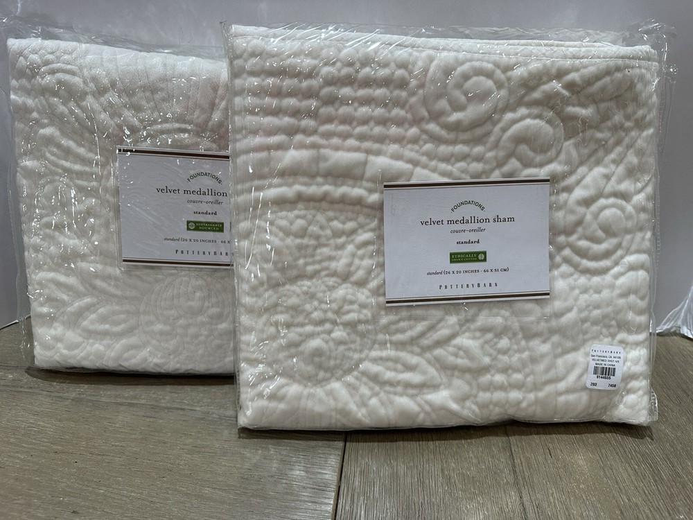 new in package. 2 pottery barn velvet medallion standard shams in ivory