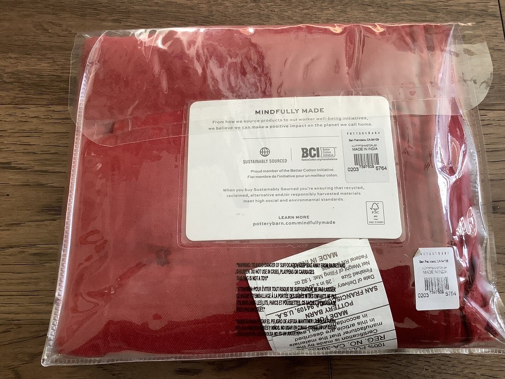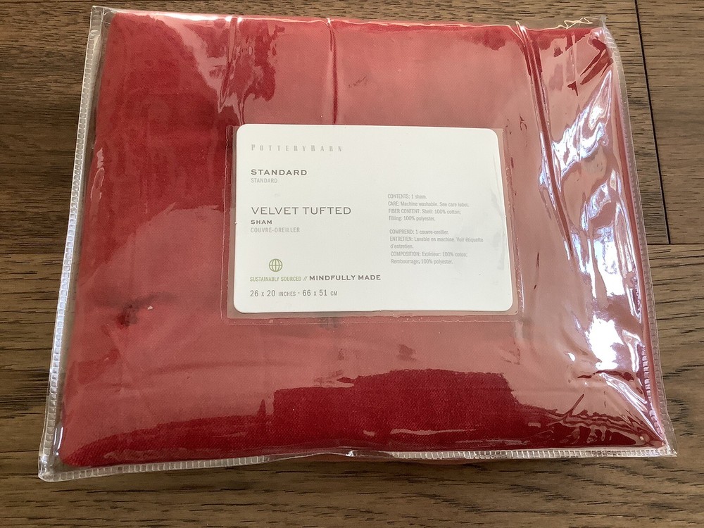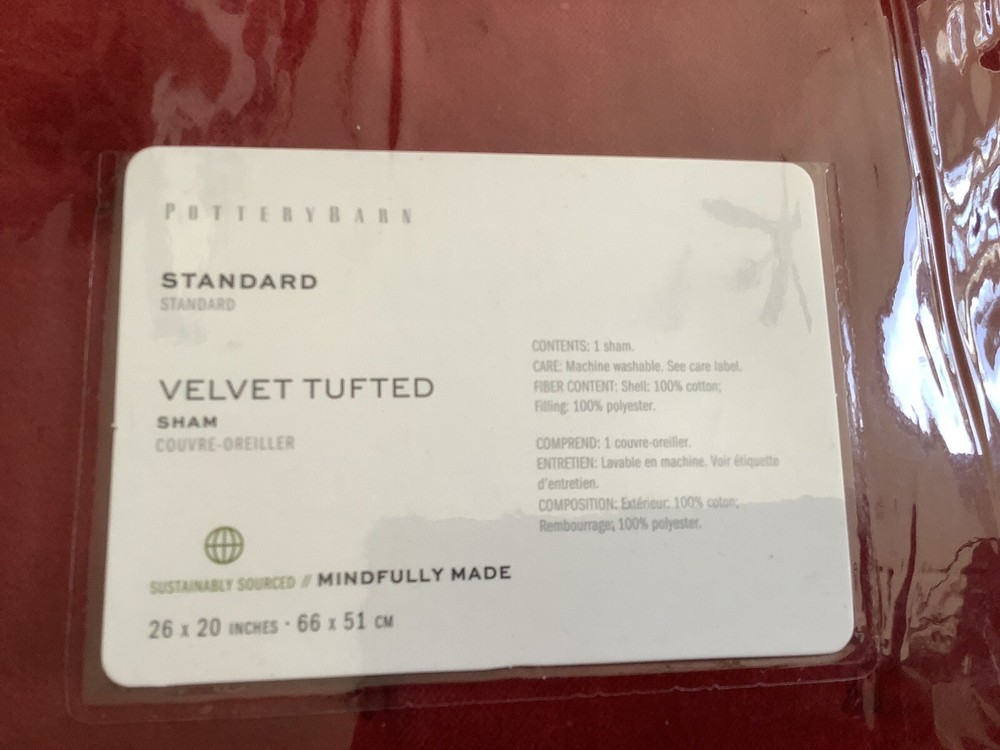 Add a touch of elegance to your bedroom with this stunning red velvet pillow sham from Pottery Barn. The tufted design adds a luxurious texture that is sure to impress. This standard size sham is perfect for any bed and will complement any decor. Made with high-quality velvet material, this pillow sham is soft and comfortable to use. It comes with tags still attached, making it a great gift idea for your loved ones. Upgrade your bedding with this Pottery Barn velvet tufted sham in ruby red.