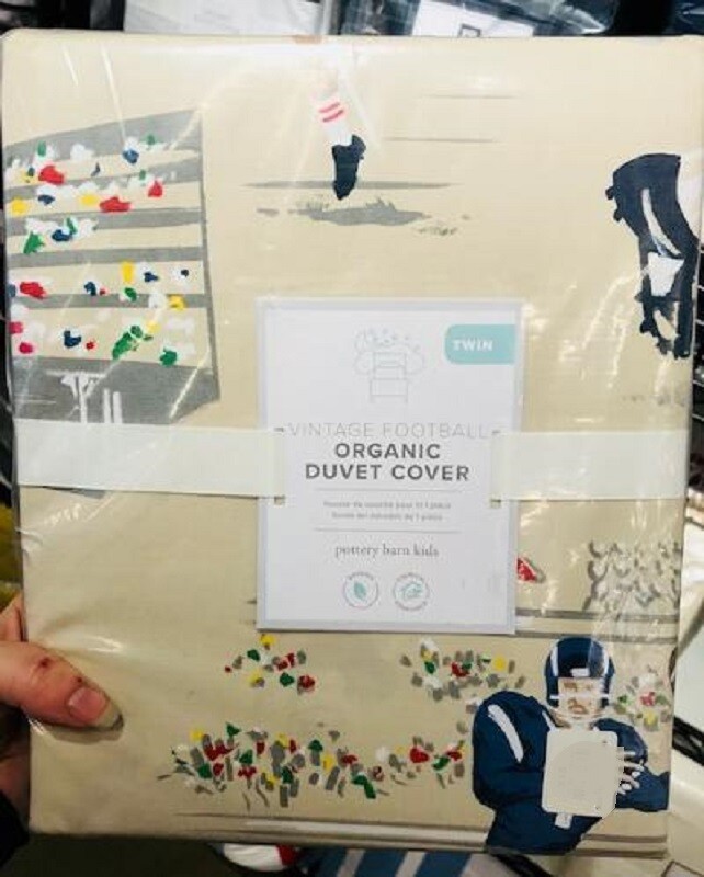 POTTERY BARN VINTAGE FOOTBALL DUVET Bring sporty style to your little one's space with a colorful, painterly depiction of their favorite game. Supremely soft and meeting the strictest healthy production standards, our organic duvet cover provides lasting comfort. Made of 100% organic cotton; 200-thread count. Duvet cover is finished with interior corner ties and a hidden button closure to keep the duvet in place. Sham features an envelope closure. Duvet cover and sham reverses to self. Machine wash. Imported. Auction is for TWIN duvet, sorry not shams with this auction. Item is BRAND NEW in ORIGINAL PACKAGING! A d d i T i O N a l P h o T O s A v a i L a B Le U p O n R e Q u e S T PURCHASED DIRECTLY FROM POTTERY BARN KIDS. AUTHENTIC.