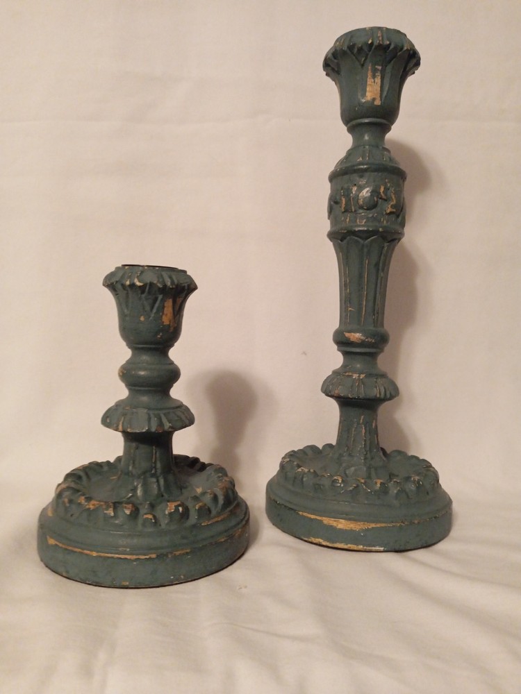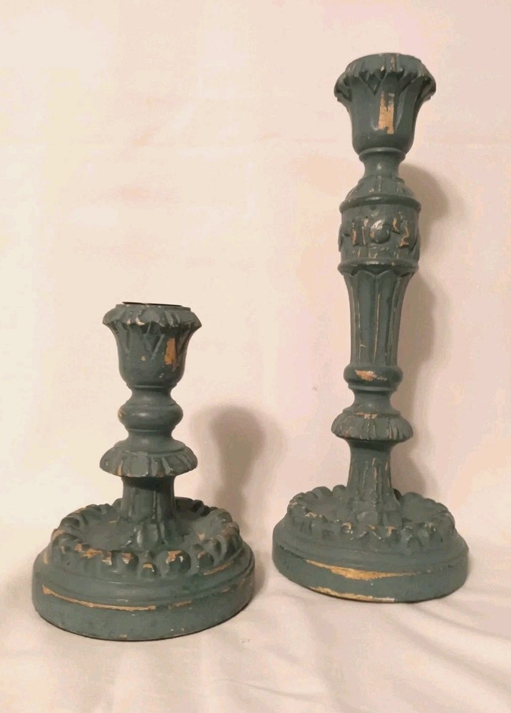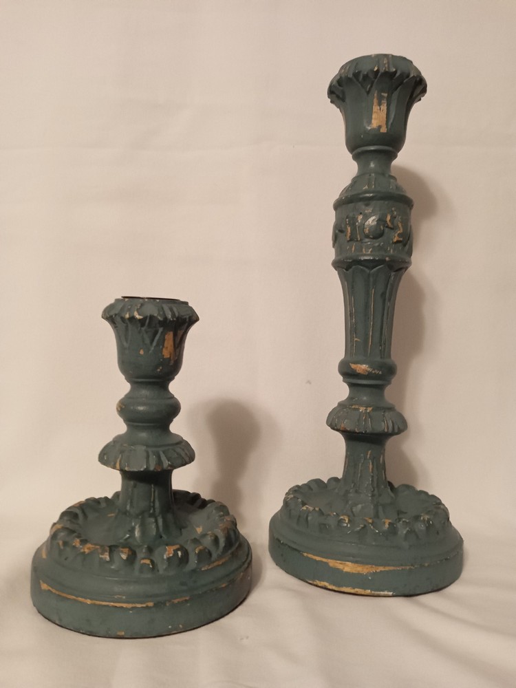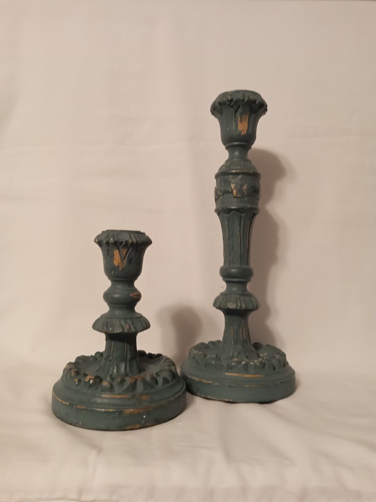 Handcrafted from mango wood and painted in teal. Also features a bronze steel cup where taper candle inserts into the wood base. Mango wood is sourced sustainably from orchard trees that no longer beat fruit, that would otherwise be cleared to make room for younger, more productive trees. Variation in color and texture are inherent to each product. No two pieces are exactly alike. Holds a standard taper candle sold separately. Clean with dry cloth. Overall- 4.75" diam, 12" h 4.75" diam, 6" h