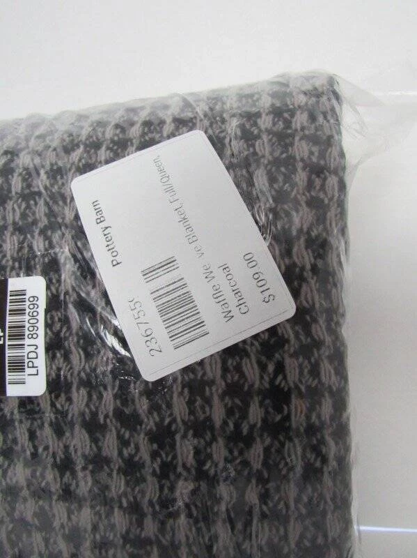 Pottery Barn Waffle Weave Blanket, Full Queen Charcoal Color New Pottery Barn Waffle Weave Blanket, Open Box----New with tags 1 F/Q Blanket----92" wide x 96" long----234 cm x 244 cm Color--Charcoal A classic waffle weave and a goes-with-anything hue combine in our stylish blanket. Woven from a soft cotton blend and yarn-dyed for rich, lasting color, it adds textural dimension and a lightweight, cozy accent to your bed or armchair. Details Material: Blanket is woven of 50% cotton and 50% acrylic. Color Quality: Yarn-dyed fiber has incredibly rich color that holds its vibrancy over time. Certification and Standards: OEKO-TEX® STANDARD 100 certified, tested for 1000+ harmful substances (14.HUS.42449 HOHENSTEIN HTTI). By choosing our cotton products, you’re supporting our investment in Better Cotton’s mission. This product is sourced via mass balance and therefore may not contain Better Cotton. Place of Manufacture: Imported. CARE INSTRUCTIONS Machine wash in cold water; gentle cycle. Tumble dry on low heat. See my other listings for more great items! Please read our return policy before you purchase: We take pride in our business, and we strive to do our best. We purchase brand new items and we do our best to give accurate descriptions and photos. If you have any questions about an item, please contact us through eBay prior to your purchase. We try our best to resolve any issues as fast as possible. Please contact us right away if there are any issues with your purchase. Item must be returned within 30 days of the original delivery date. When we receive the returned item, inspect it, and it is found to be in the same condition that we shipped it in (brand new, unused and in the original packaging) You will immediately receive your refund. Returns that have any signs of use or handling will NOT be accepted and no refund will be given. Thank you! Please read our return policy before you purchase: We take pride in our business, and we strive to do our best. We purchase brand new items and we do our best to give accurate descriptions and photos. If you have any questions about an item, please contact us through eBay prior to your purchase. We try our best to resolve any issues as fast as possible. Please contact us right away if there are any issues with your purchase. Item must be returned within 30 days of the original delivery date. When we receive the returned item, inspect it, and it is found to be in the same condition that we shipped it in (brand new, unused and in the original packaging) You will immediately receive your refund. Returns that have any signs of use or handling will NOT be accepted and no refund will be given. Thank you! Feedback: We strive to give you the best service. If you have any issues regarding your item, please contact us right away . Customer satisfaction is our priority. We accept MasterCard, Visa, Discover, Paypal and American Express, securely and conveniently via eBay Managed Payments. We will use the address listed on your eBay account...so please make sure it is correct. WE WILL SHIP TO CONFIRMED EBAY ADDRESSES ONLY!! DO NOT send money via PayPal if your address is not confirmed...we will not be able to accept it. We provide fast shipping! Your item will be shipped within 1-3 business days via UPS, USPS priority mail or Fed-Ex. We reserve the right to choose shipping company. They can NOT deliver to PO boxes, so please provide us with a physical street address. Once your item is shipped you will receive an email with your tracking number. We are HAPPY to combine shipping on items that can be combined. Please email us for shipping rates to HI and AK. Signature at delivery is required for all items over $250. All items must also be shipped to the address on your eBay account.. We are enrolled in eBay's Global Shipping Program . Only countries approved in eBay's Global shipping can receive deliveries from us. Other Items Feedback Contact txzj pxzj432 txzj-11 txzj-4 txzj1 txzj115