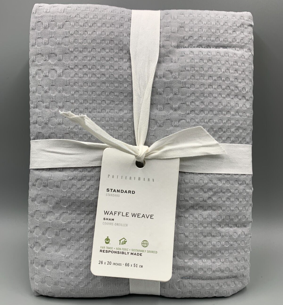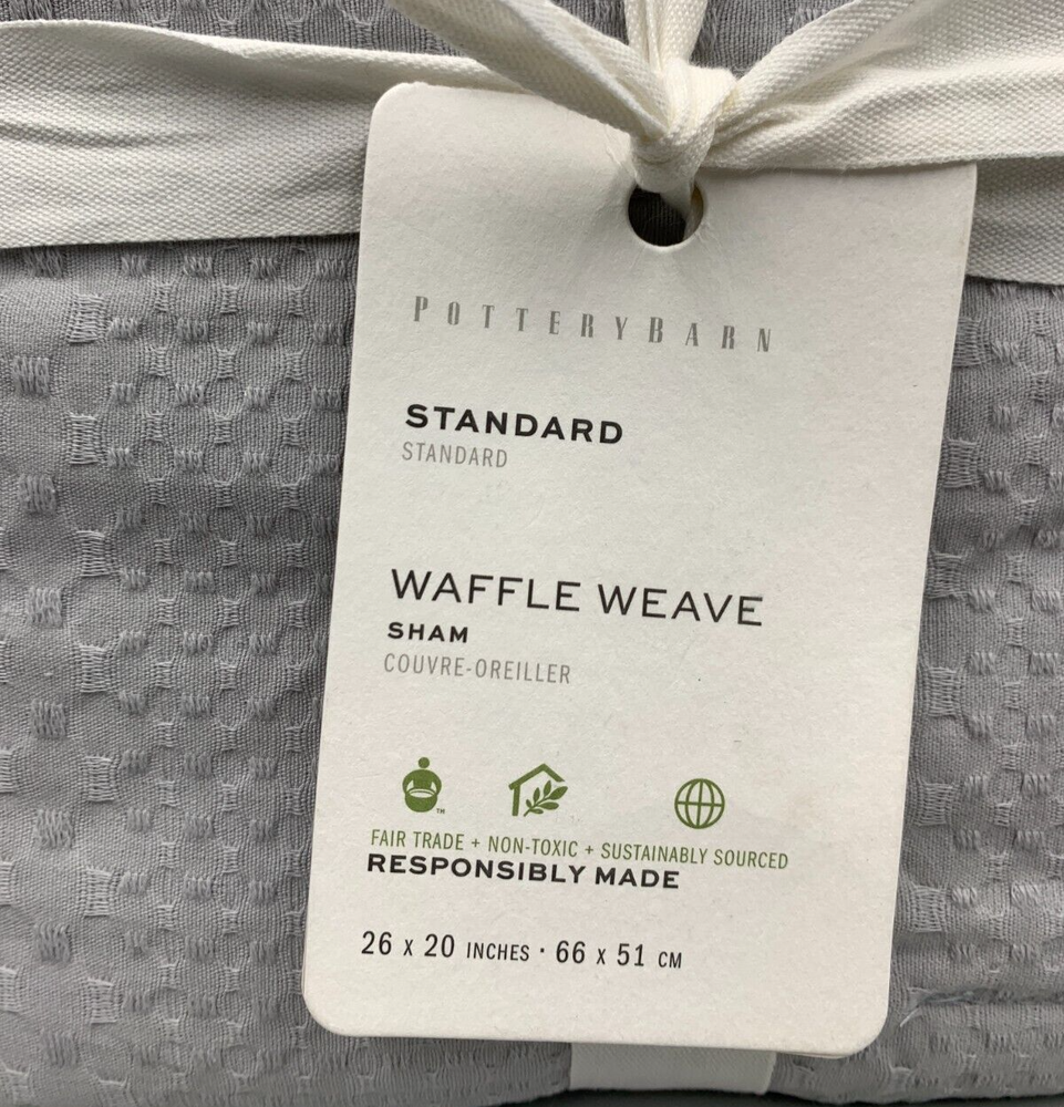 Pottery Barn Waffle Weave Textured Organic Cotton Sham Standard Gray Mist #9276M Item is brand new! Auction incldues: 1 Standard Sham Crafted of pure cotton percale Woven of 100% cotton percale. STANDARD 100 by OEKO-TEX® certified. Fair Trade Certified™ 200-thread count. Sham features an envelope closure. Reverses to same. Machine washable. Imported. DIMENSIONS Standard: 20" h x 26" w CARE AND MAINTENANCE Machine wash in warm water; gentle cycle. Only non-chlorine bleach when needed. Tumble dry on low heat; remove promptly. Warm iron as needed.