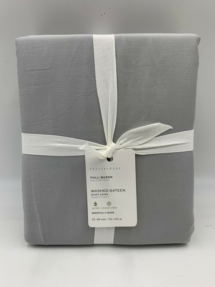 Pottery Barn Washed Cotton Sateen Duvet Cover Full Queen Gray Mist 400 Thread Count #P31 Item is brand new! Auction includes: 1 Duvet Cover Made of 100% cotton sateen. Pottery Barn is a proud member of the Better Cotton Initiative Fair Trade Certified™. The purchase of this product helps ensure fair and safe labor practices, improve livelihoods, and empower workers to invest in their communities. Duvet features a button closure and interior ties to help keep insert (sold separately) in place; sham features an envelope closure. 400-thread count. Duvet reverses to solid. Duvet and insert sold separately. Machine wash. Imported. DIMENSIONS Duvet Cover Full/Queen: 88" l x 92" w King/Cal King: 92" l x 108" w CARE AND MAINTENANCE Machine wash warm; gentle cycle with like colors. Use only non-chlorine bleach if needed. Tumble dry low; remove promptly. Warm iron as needed.