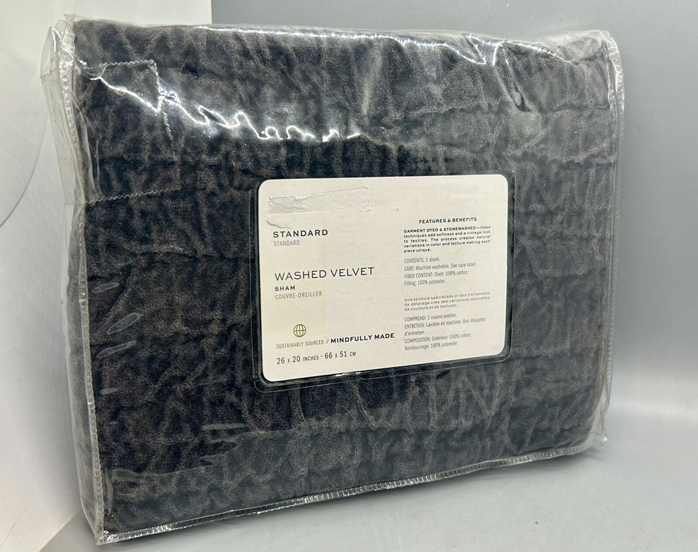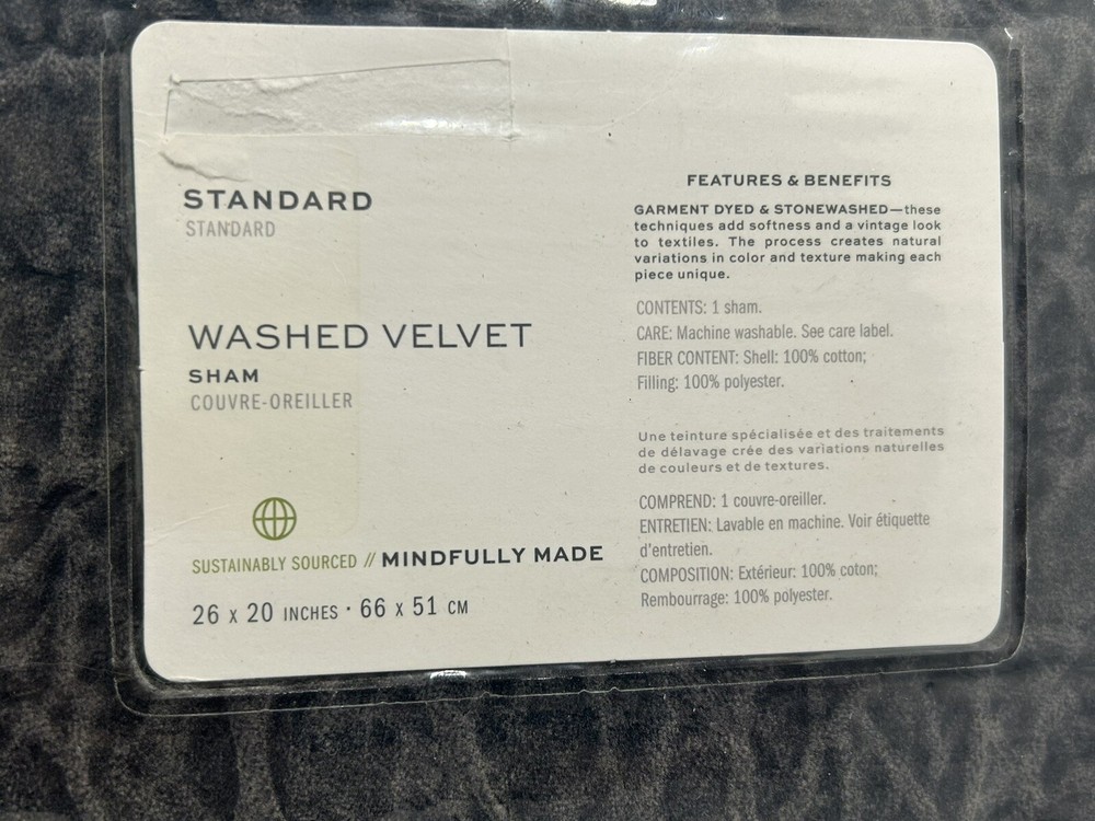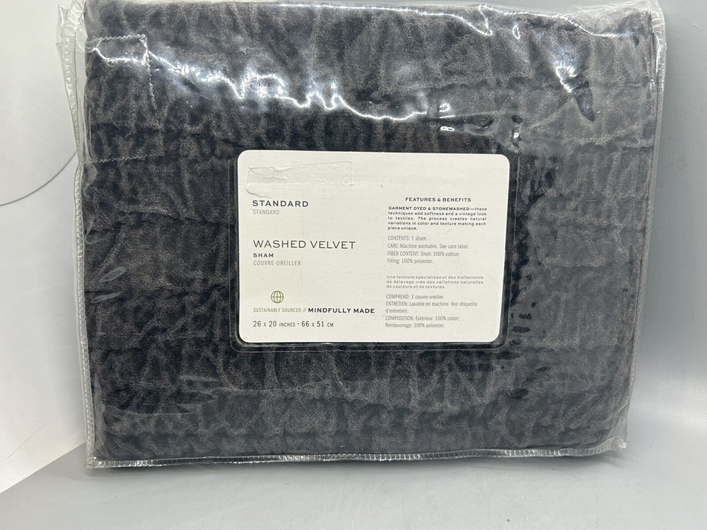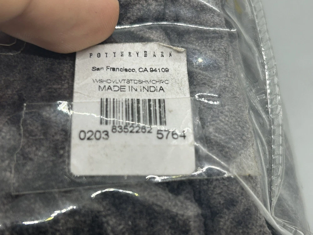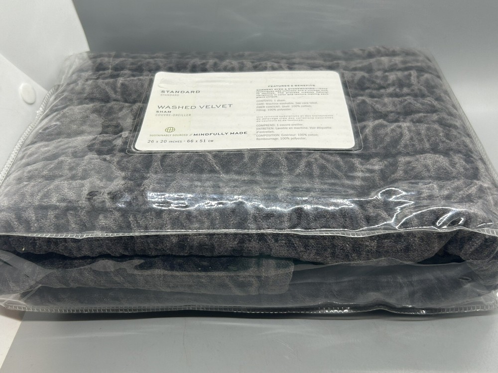New, unused Pottery Barn Washed Velvet Handcrafted Quilted Pillow Sham, Standard size, Charcoal Gray. Measures 20” x 26”. The shell is 100% cotton, the filling is 100% polyester. Message me with any q...