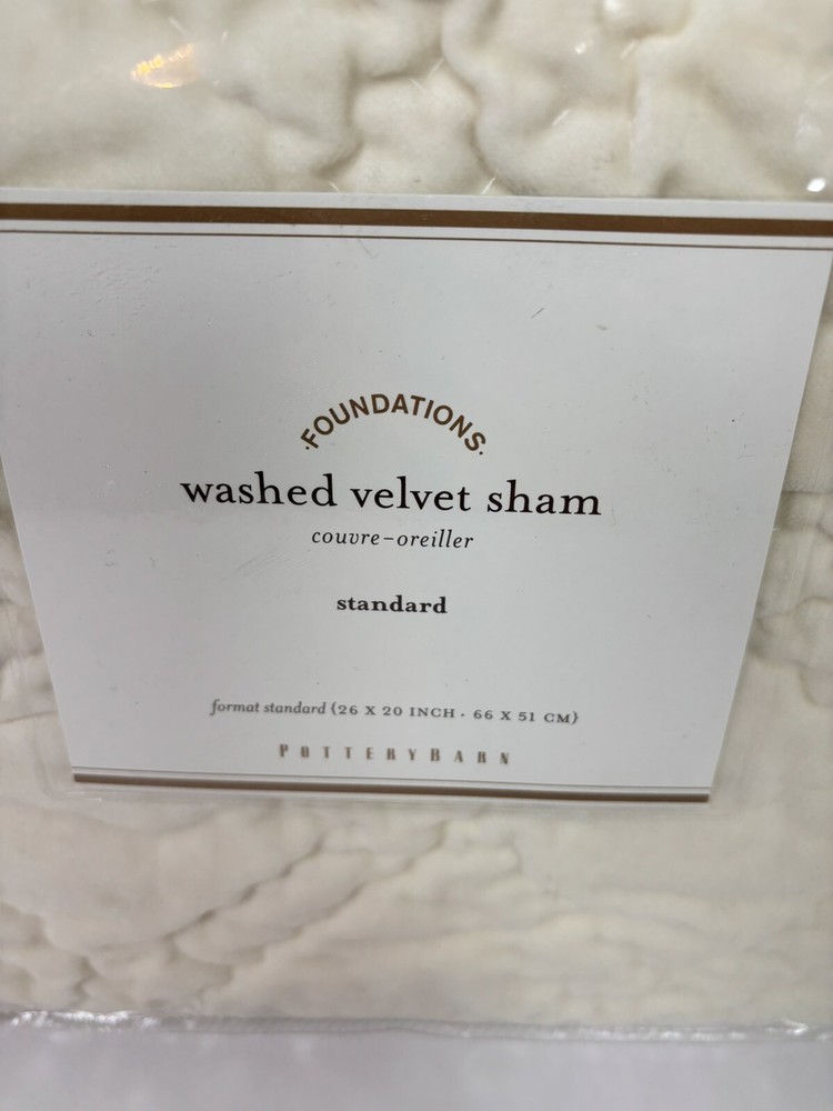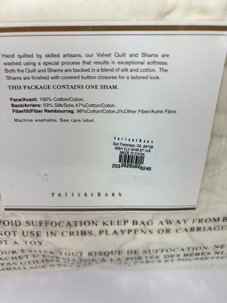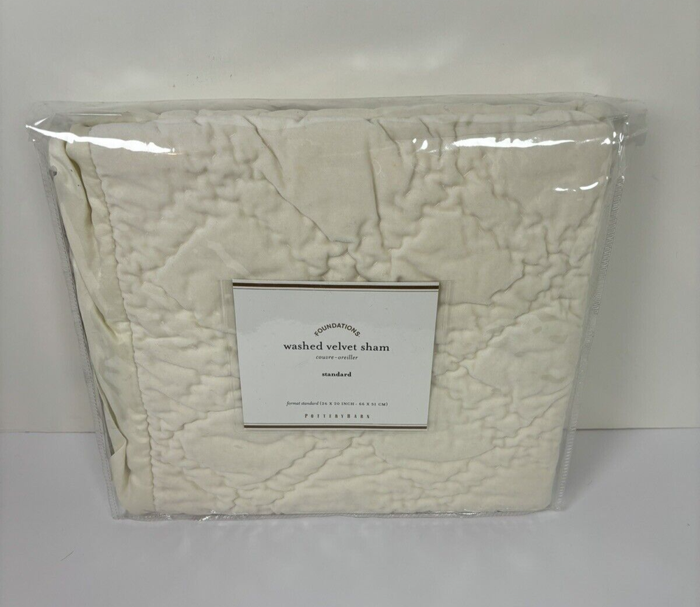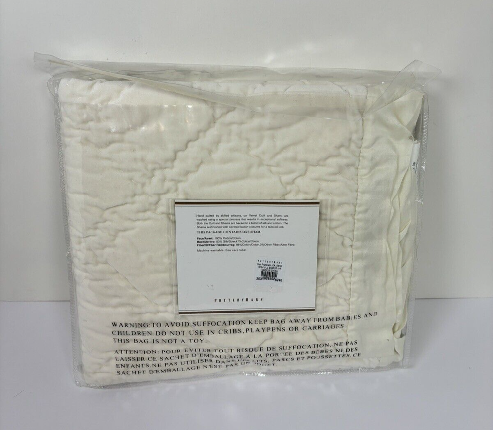 Pottery Barn Washed Velvet 1 Standard Sham Color: Ivory 100% Cotton Velvet front with double diamond stitched pattern. Reverse is a smooth 53% silk & 47% cotton. Edge is finished with a silk-cotton flange. Covered button closure. Condition Specifics: New in original packaging as pictured.