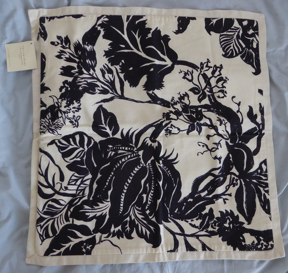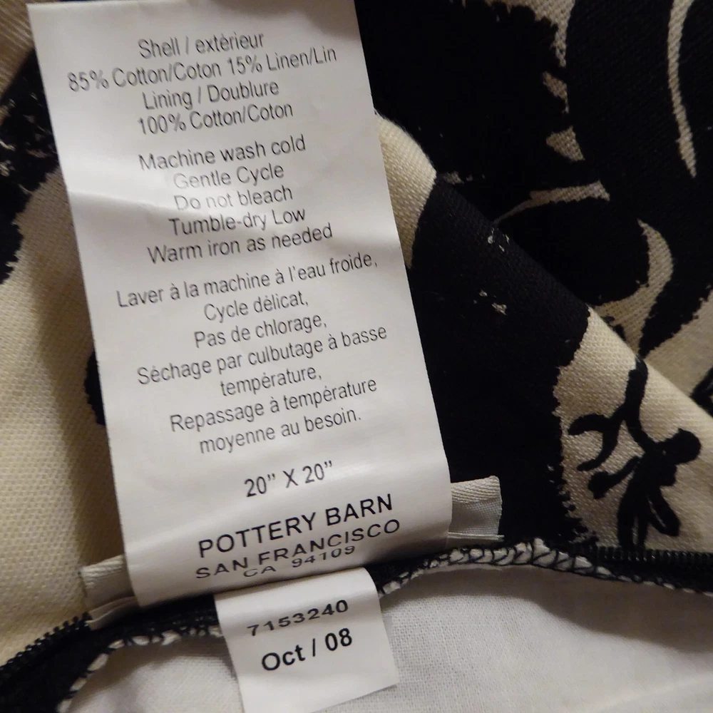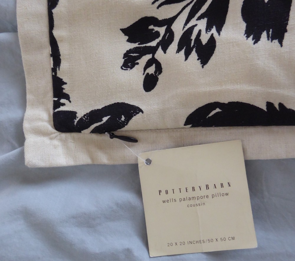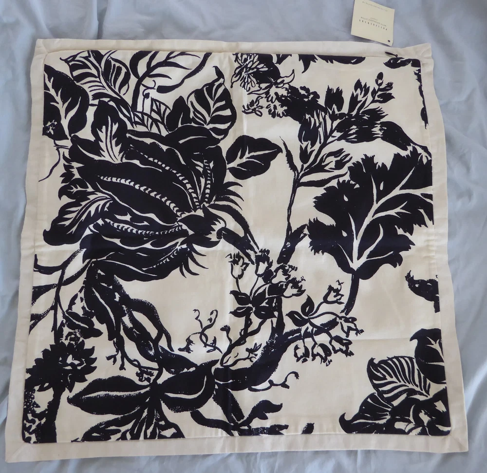 Pottery Barn Wells Palampore pillow sham. Black and white floral design, front and back. Euro-style size. Zipper closure. Outer shell is 85% cotton, 15% linen. Made in India. Believed to date from October 2008, based on inside label information. New with tags. No pillow included. Measures approximately 21 1/2 inches by 21 1/2 inches, including a 3/4-inch border. Please note the overall measurements differ slightly from the measurements printed on the inside label. Excellent condition. Odor-free. No tears, rips, holes, snags, spots, or stains. Very clean. Some wrinkles from storage. Finely made pillow sham. Exceptional quality. No original packaging. PayPal is the only accepted form of payment. International shipping is available, but only according to terms and conditions established by ebay under its international marketing program launched in 2023. In that program, ebay calculates international postage and bills an international buyer for the item cost, full shipping cost, associated taxes, and fees AFTER a purchase has been made. Please note the full shipping cost ultimately billed to an international buyer will be higher than the U.S. domestic shipping cost posted in the item listing. After total payment has been received by ebay from the buyer, the seller ships the item to a designated ebay international shipping hub in the U.S. for re-packaging and customs paperwork preparation. Once these steps are completed, ebay tenders the item to USPS for shipping to its final, foreign destination. Shipped using USPS Ground Advantage Mail package service to all U.S. domestic destinations. Please ask questions prior to purchase. Additional pictures provided upon request. No returns allowed. Thank you for viewing this item.