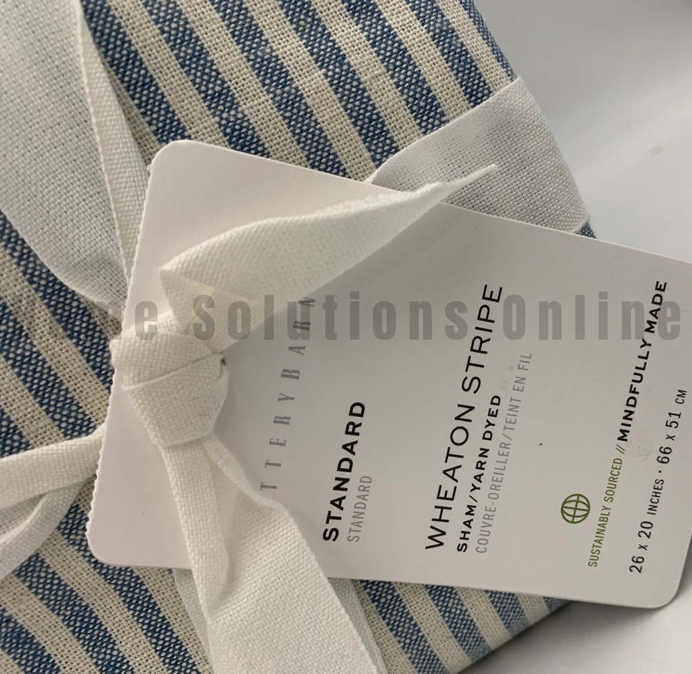 Pottery Barn Wheaton Striped Duvet Cover and Shams R74 R133 Items are brand new Auction includes: 1 king duvet cover and 2 standard shams PRODUCT DETAILS CONSTRUCTION: Made from 55% linen and 45% cotton. Yarn dyed for rich and lasting color that wears well over time. Duvet and shams reverse to the same stripe pattern. Duvet and shams feature button closure. Imported. CARE: Machine wash in cold water; gentle cycle. Use only non-chlorine bleach when needed. Tumble dry on low heat; remove promptly. Warm iron as needed. DIMENSIONS: Full/Queen: 88" l x 92" w King/Cal King : 92" l x 108" w Standard : 20" h x 26" w Euro: 26" sq King/Cal. King: 20" h x 36" w