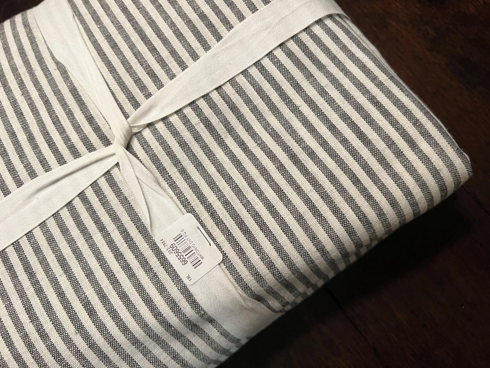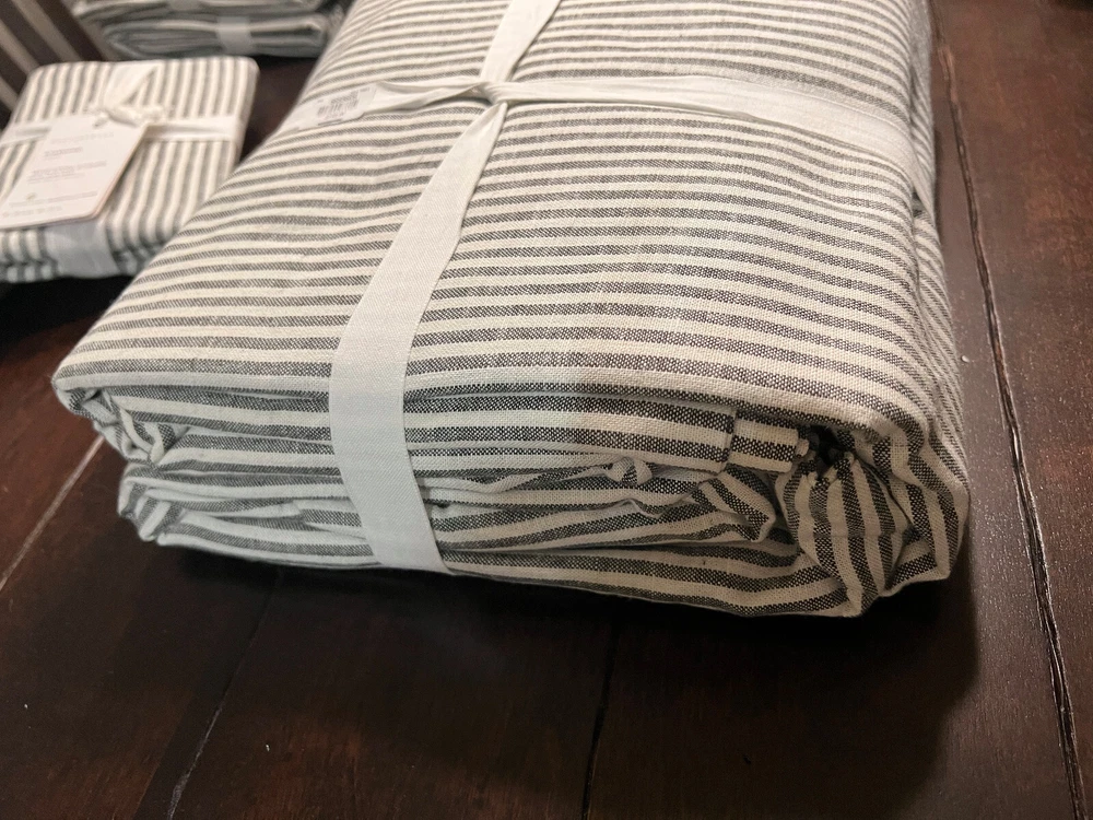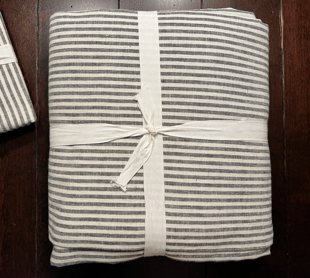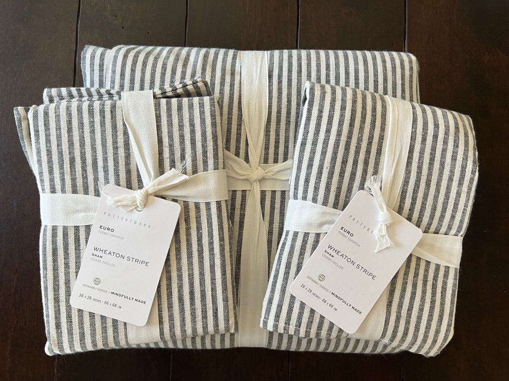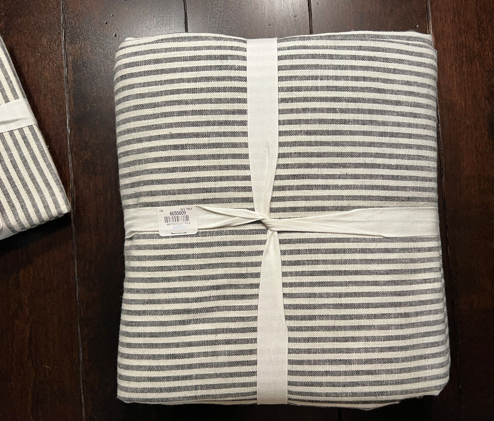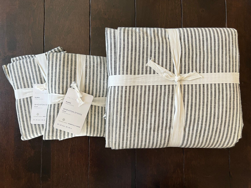 Pottery Barn Wheaton Striped Linen Cotton Duvet Cover & Shams New - Duvet is missing the tag, shams have tags Set includes: 1 Full/Queen Duvet Cover & 2 Euro Shams Color: Gray Please let me know if you have any questions. no returns Tailored with thin stripes for a classic look with timeless appeal, Wheaton bedding layers equally well with solids and patterns. Made from 55% linen and 45% cotton Yarn dyed for rich and lasting color that wears well over time Duvet and shams reverse to same stripe pattern Duvet and shams feature button closure Machine wash, tumble dry Full/Queen Duvet: 88" long x 92" wide Euro Shams: 26" high x 26" wide