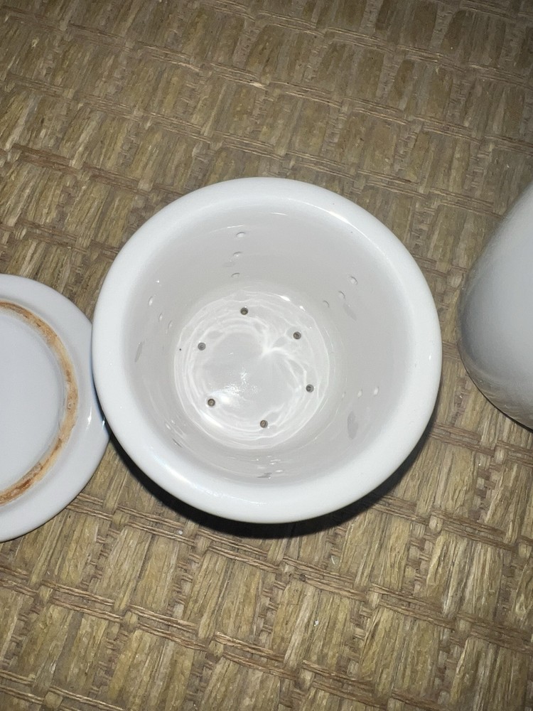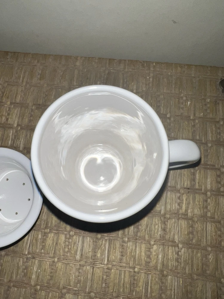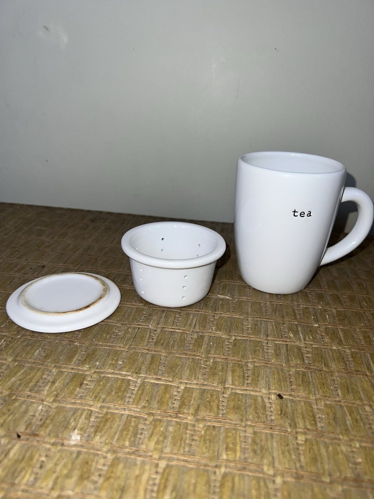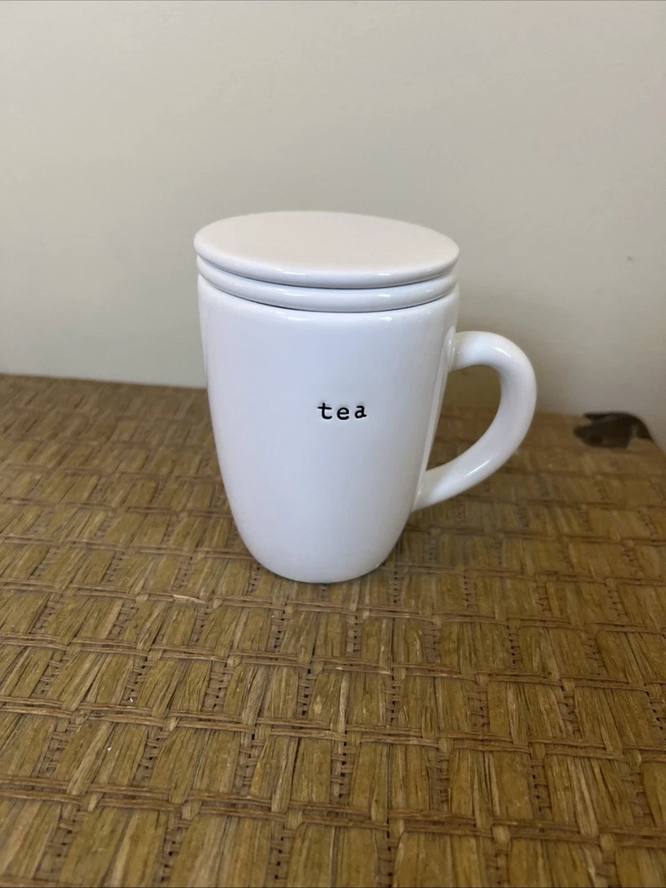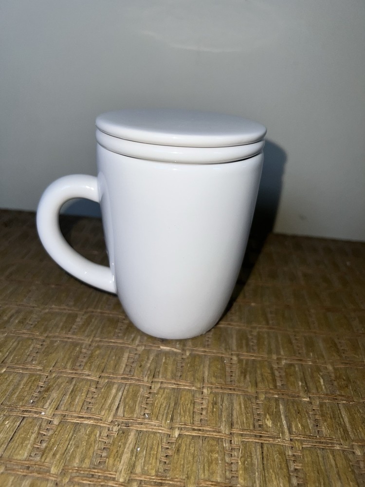 The Pottery Barn White Coffee House Tea Mug is a 4 1/2" ceramic mug designed for enjoying tea. It features a lid and a built-in strainer, making it ideal for brewing loose leaf tea. The mug is in a classic white color with a Coffee House pattern, adding a touch of charm to your tea-drinking experience. Perfect for tea lovers who appreciate both style and functionality in their drinkware collection.