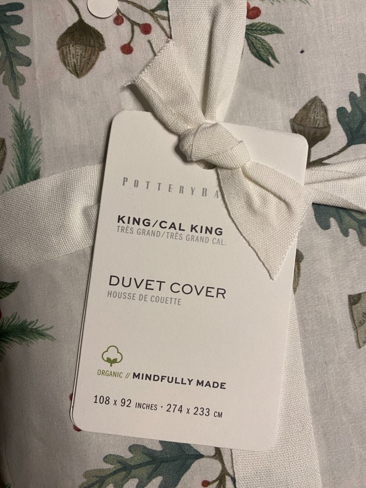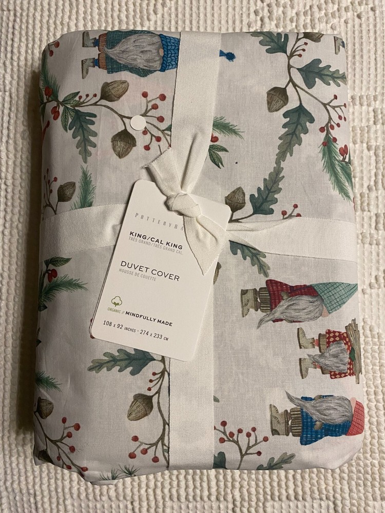 Adorable Pottery Barn Forest Gnome King / Cal King duvet cover in white. Measures 108 x 92. Material is 100% organic cotton. New with tags. Matching shams and sheet set also listed....