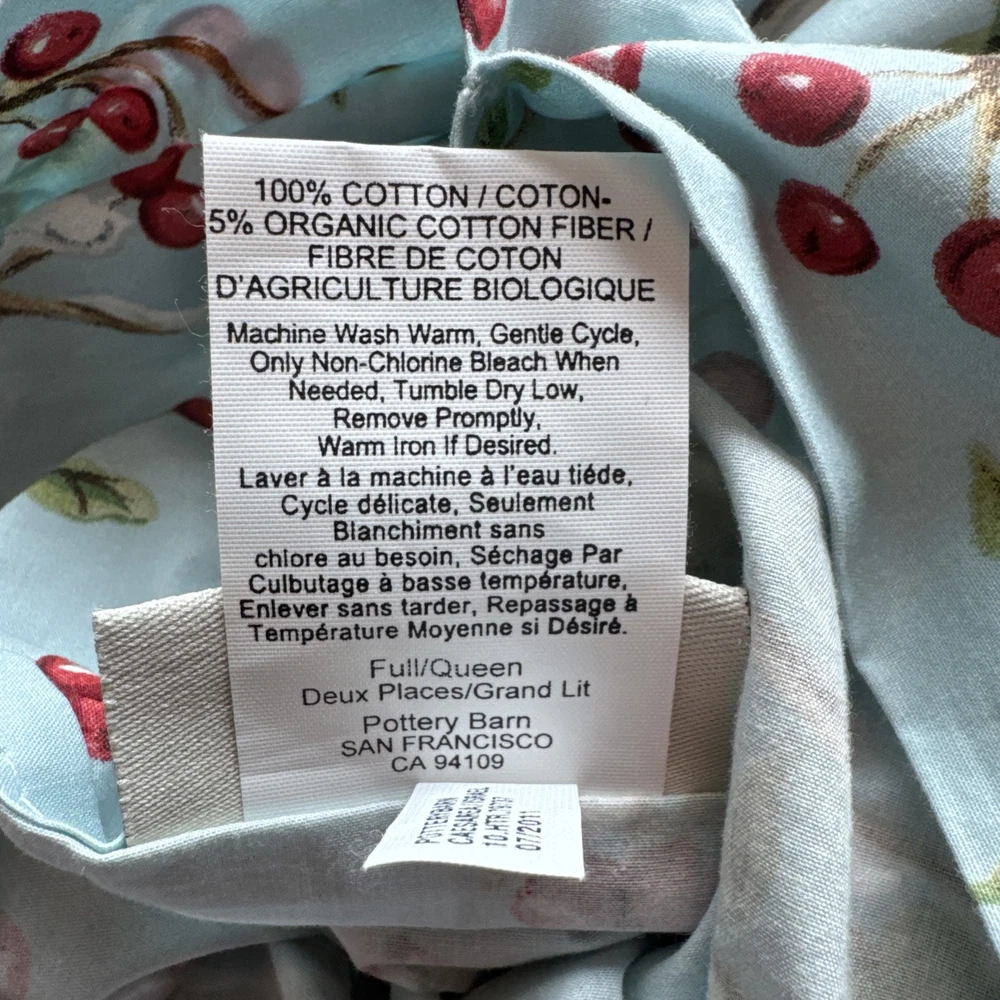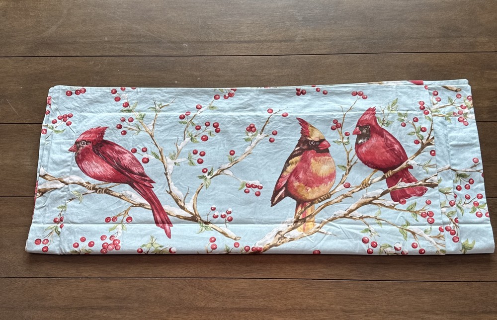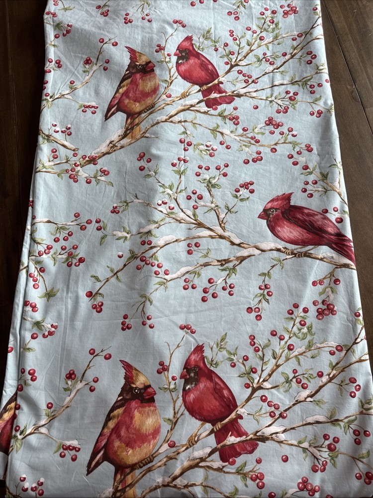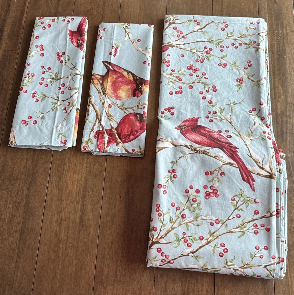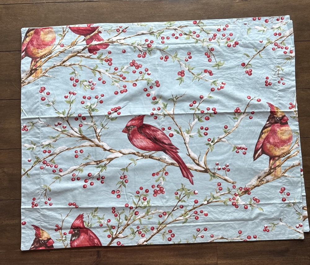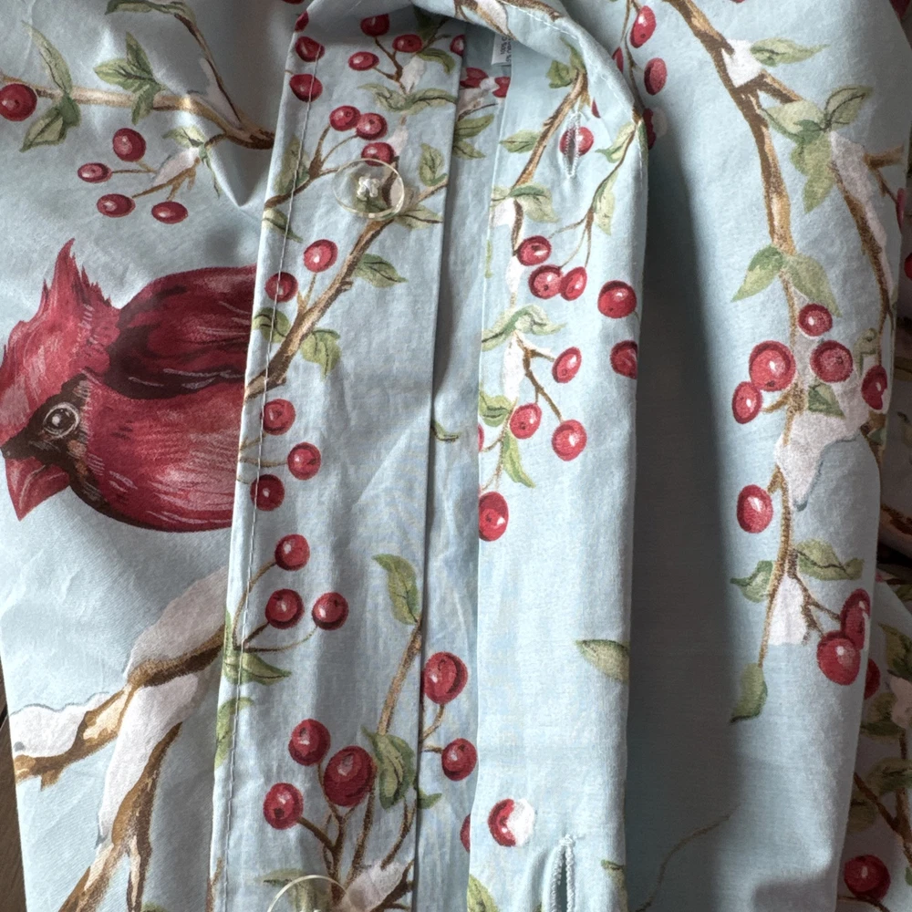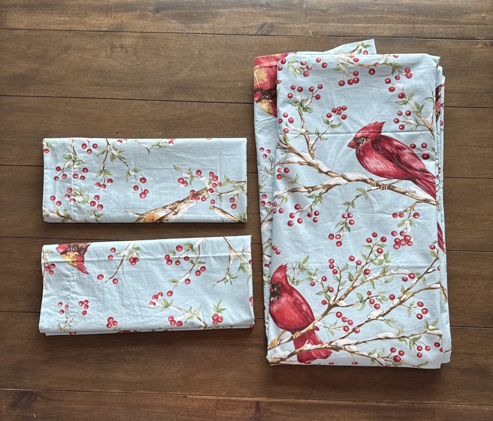 This set is in gorgeous condition! The fabric is crisp and the colors are very vibrant. No blemishes, like brand new condition. The Pottery Barn Winter Cardinal Blue Queen Duvet & 2 Shams set features a charming bird pattern with cardinals and holly berry branches, perfect for adding a touch of nature to your bedroom. Made of 100% organic cotton, this three-piece set includes a duvet cover and two pillowcases, all in a cozy cottage style. The blue, red, green, and white color palette adds a festive and countryside vibe, ideal for teens, adults, and kids alike. Easy to care for with machine washable features and a button closure for convenience. 2 - 24x30 shams