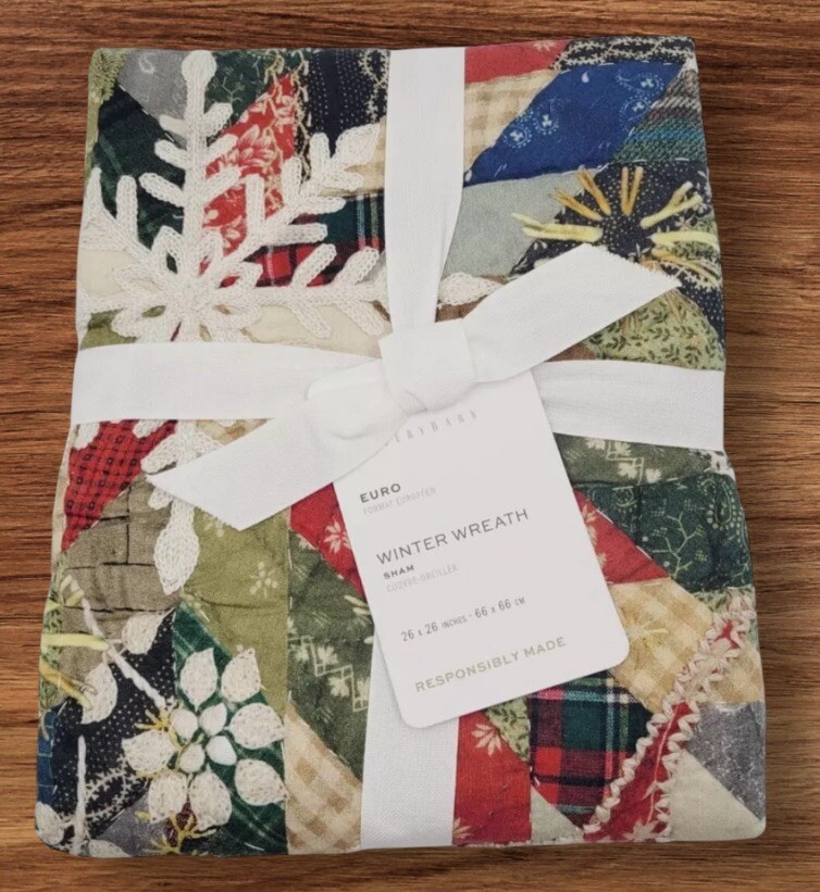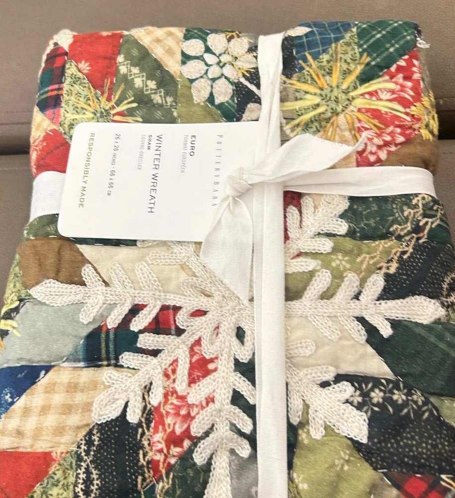 1 Pottery Barn Christmas Winter Wreath Quilted Euro Sham Euro Sham Measures 26" sq. Hand Quilted of 100% Cotton. Filled with 100% Polyester. Reverses to Coordinating Pattern For Two Looks in One. Zipper Closure Machine Wash 100% Authentic! Brand New. Thank you for visiting. Please see my other items.