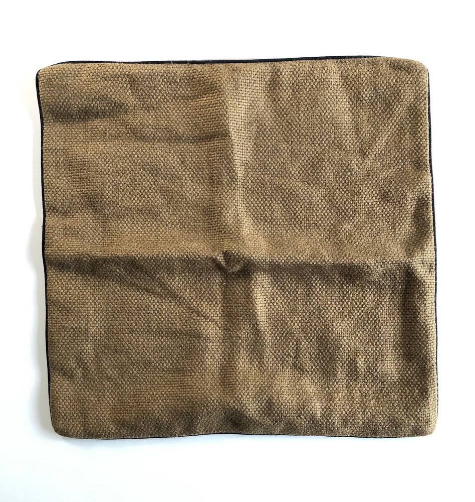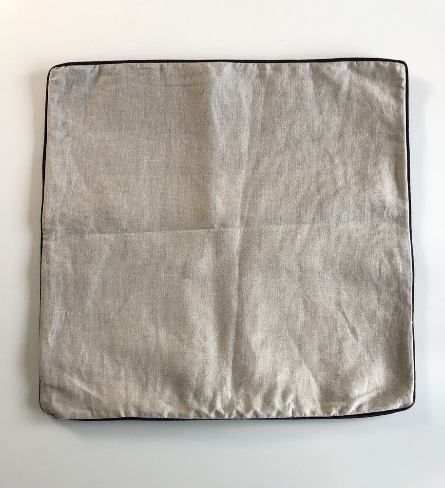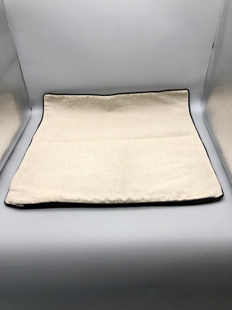 Pottery Barn Brown Linen Pillow Cover with tan cotton backing. Black piping trim, zipper closure. Dry clean only. Measures approximately 20” by 20”. This item is in used condition. It shows minor signs of use or wear. No rips, holes or stains. Prior to purchasing please refer to all photos. Ships from a smoke free home. Thanks for looking. S242