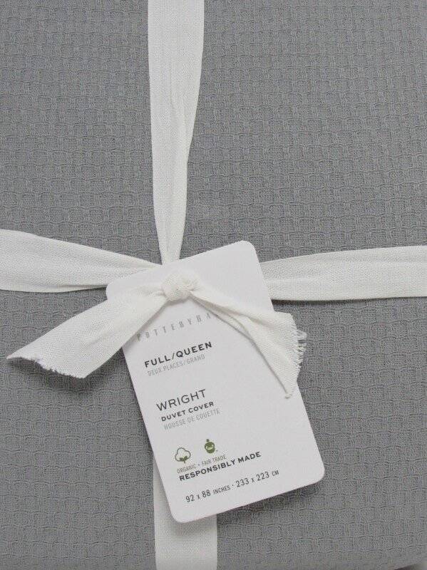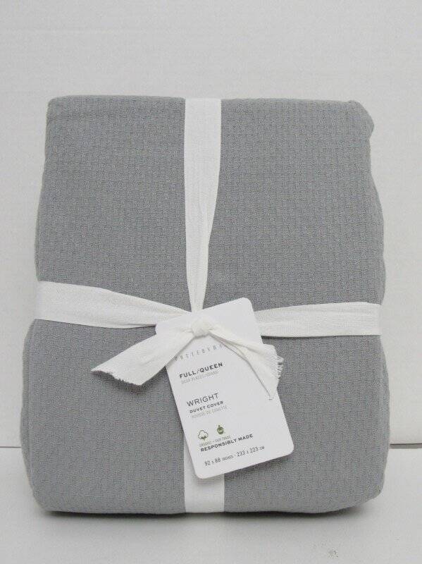 Pottery Barn Wright Textured Organic Duvet Cover, F/Q Gray Color NWT Pottery Barn Wright Textured Organic Duvet Cover, New with tags... 1 F/Q Duvet cover----92 long x 88" wide----233 x 223 cm Color--Gray Add a hint of texture to your bed with this subtle honeycomb pattern. Made from organic cotton, this bedding has a soft hand that feels cozy and familiar. A great foundational piece, its perfect for layering with other patterns and solids. PRODUCT DETAILS CONSTRUCTION Made with organic cotton. Reverses to solid. Duvet features a hidden button closure with inner ties that keep insert in place. Made in a Fair Trade Certified™ factory. Machine wash. Imported. CARE AND MAINTENANCE Machine wash on warm. Only use non-chlorine bleach when needed. Tumble dry. Warm iron as needed. See my other listings for more great items! Please read our return policy before you purchase: We take pride in our business, and we strive to do our best. We purchase brand new items and we do our best to give accurate descriptions and photos. If you have any questions about an item, please contact us through eBay prior to your purchase. We try our best to resolve any issues as fast as possible. Please contact us right away if there are any issues with your purchase. Item must be returned within 30 days of the original delivery date. When we receive the returned item, inspect it, and it is found to be in the same condition that we shipped it in (brand new, unused and in the original packaging) You will immediately receive your refund. Returns that have any signs of use or handling will NOT be accepted and no refund will be given. Thank you! Please read our return policy before you purchase: We take pride in our business, and we strive to do our best. We purchase brand new items and we do our best to give accurate descriptions and photos. If you have any questions about an item, please contact us through eBay prior to your purchase. We try our best to resolve any issues as fast as possible. Please contact us right away if there are any issues with your purchase. Item must be returned within 30 days of the original delivery date. When we receive the returned item, inspect it, and it is found to be in the same condition that we shipped it in (brand new, unused and in the original packaging) You will immediately receive your refund. Returns that have any signs of use or handling will NOT be accepted and no refund will be given. Thank you! Feedback: We strive to give you the best service. If you have any issues regarding your item, please contact us right away . Customer satisfaction is our priority. We accept MasterCard, Visa, Discover, Paypal and American Express, securely and conveniently via eBay Managed Payments. We will use the address listed on your eBay account...so please make sure it is correct. WE WILL SHIP TO CONFIRMED EBAY ADDRESSES ONLY!! DO NOT send money via PayPal if your address is not confirmed...we will not be able to accept it. We provide fast shipping! Your item will be shipped within 1-3 business days via UPS, USPS priority mail or Fed-Ex. We reserve the right to choose shipping company. They can NOT deliver to PO boxes, so please provide us with a physical street address. Once your item is shipped you will receive an email with your tracking number. We are HAPPY to combine shipping on items that can be combined. Please email us for shipping rates to HI and AK. Signature at delivery is required for all items over $250. All items must also be shipped to the address on your eBay account.. We are enrolled in eBay's Global Shipping Program . Only countries approved in eBay's Global shipping can receive deliveries from us. Other Items Feedback Contact txzj pxzj432 txzj-11 txzj-4 txzj1 txzj115