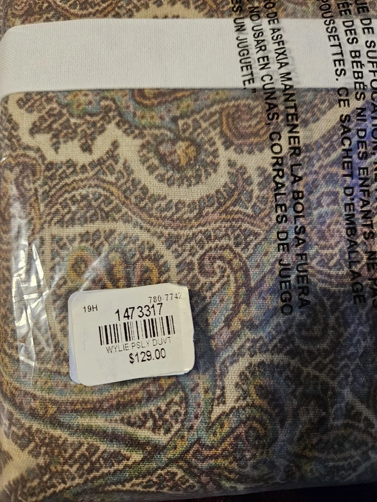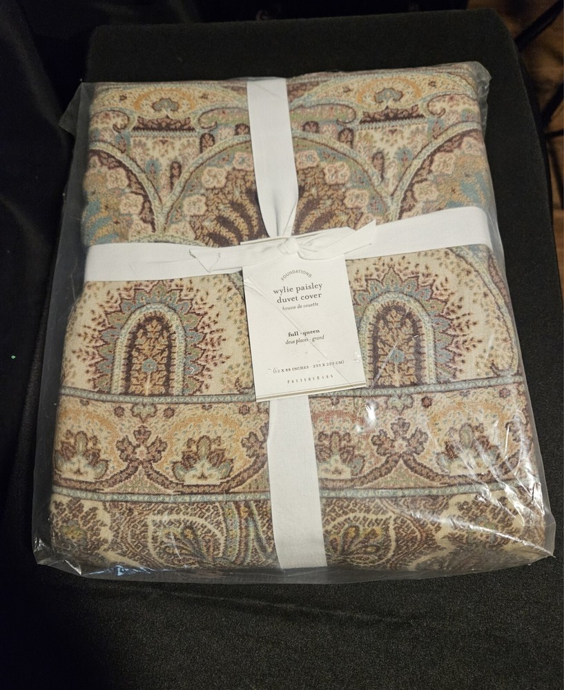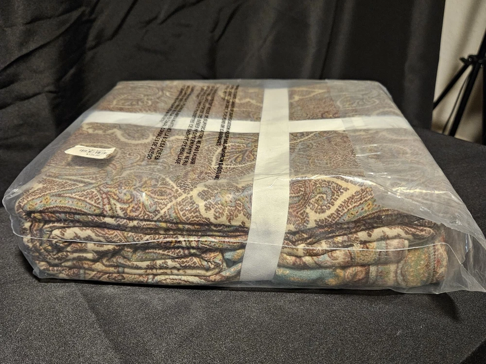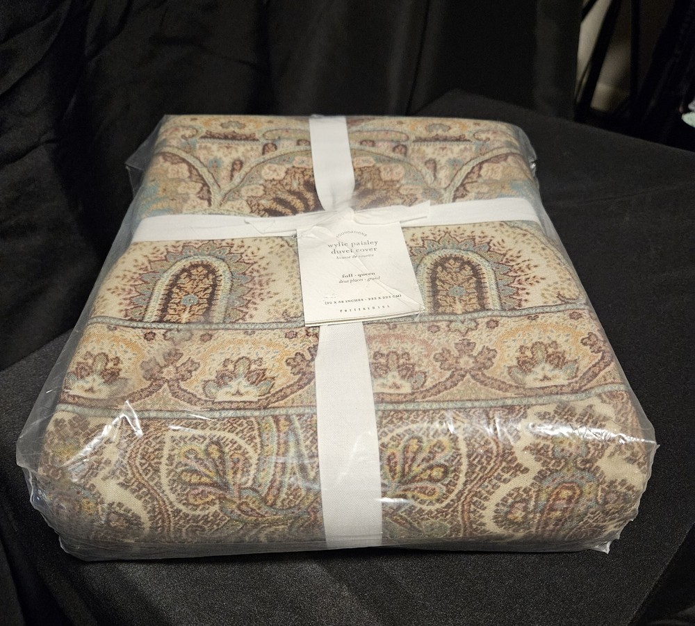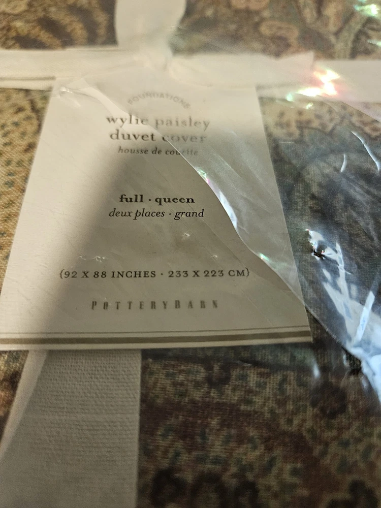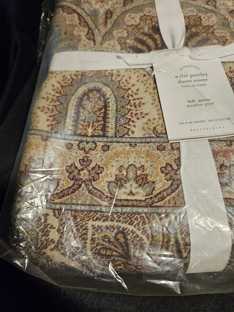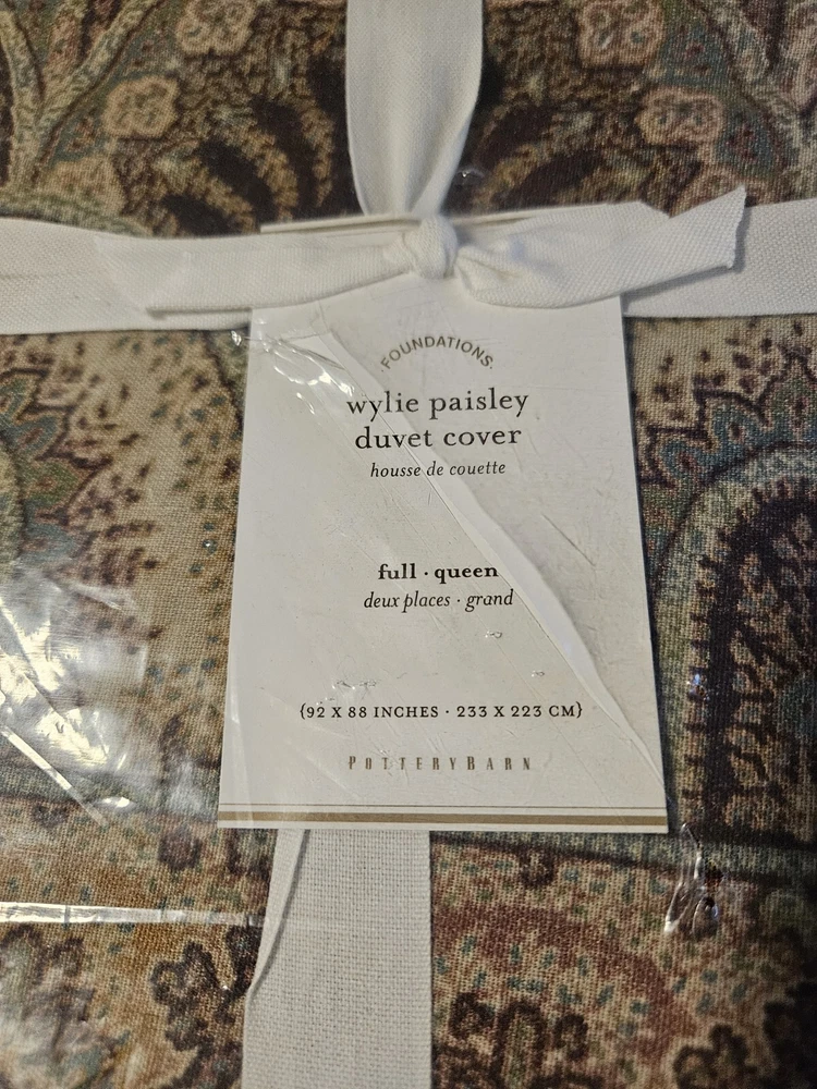 Wylie Paisley Print Cotton Duvet Cover - Brand New, never opened or used. The plastic cover has a 4" slit that is over the main tag. No damage to the actual duvet cover. PLEASE review photos closely and ask questions. NO Shams are included. Details Material: Made of an 85% cotton and 15% linen flax fabric blend. Reversible Design: Duvet reverses to a solid natural color. Secure Design: Duvet features a hidden button closure with inner ties to keep the insert in place. Care Instructions Machine wash. DIMENSIONS Duvet Cover Full/Queen: 88" long x 92" wide CARE AND MAINTENANCE Machine wash in warm water; gentle cycle. Use only non-chlorine bleach when needed. Tumble dry on low heat; remove promptly. Warm iron as needed. 0586