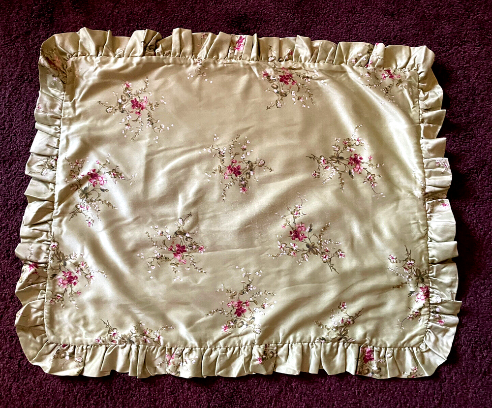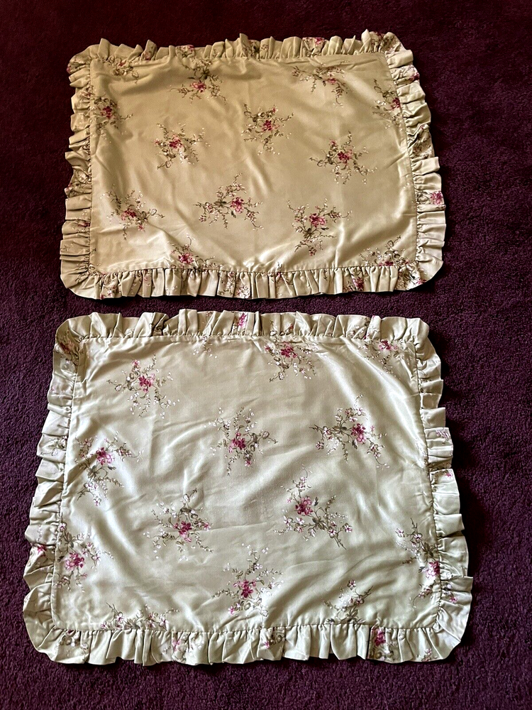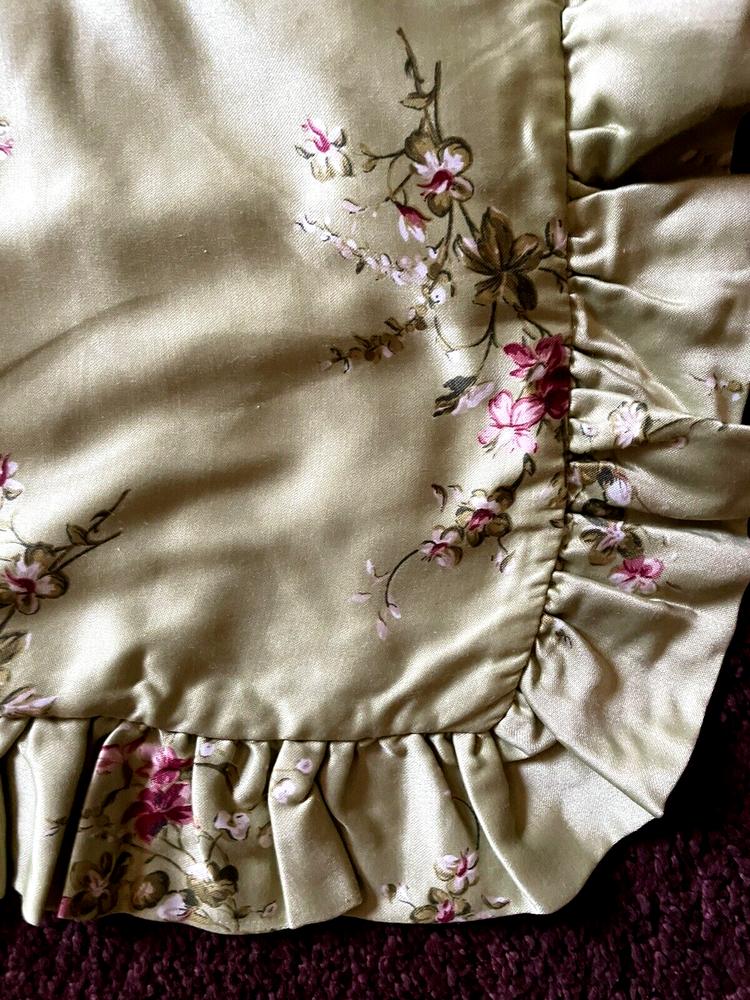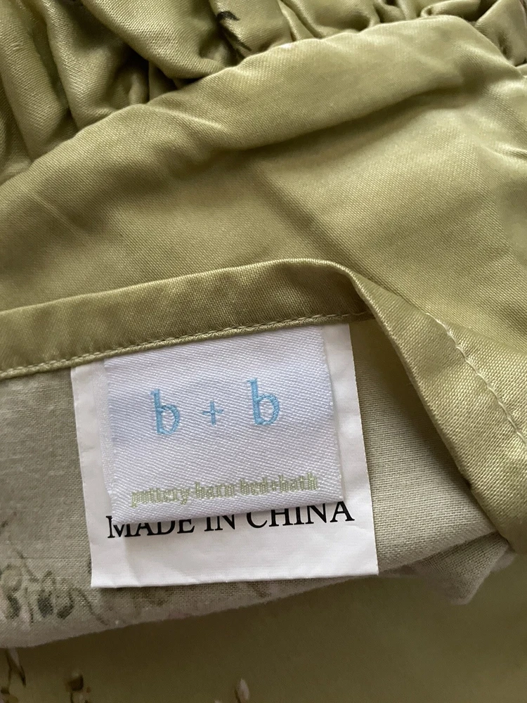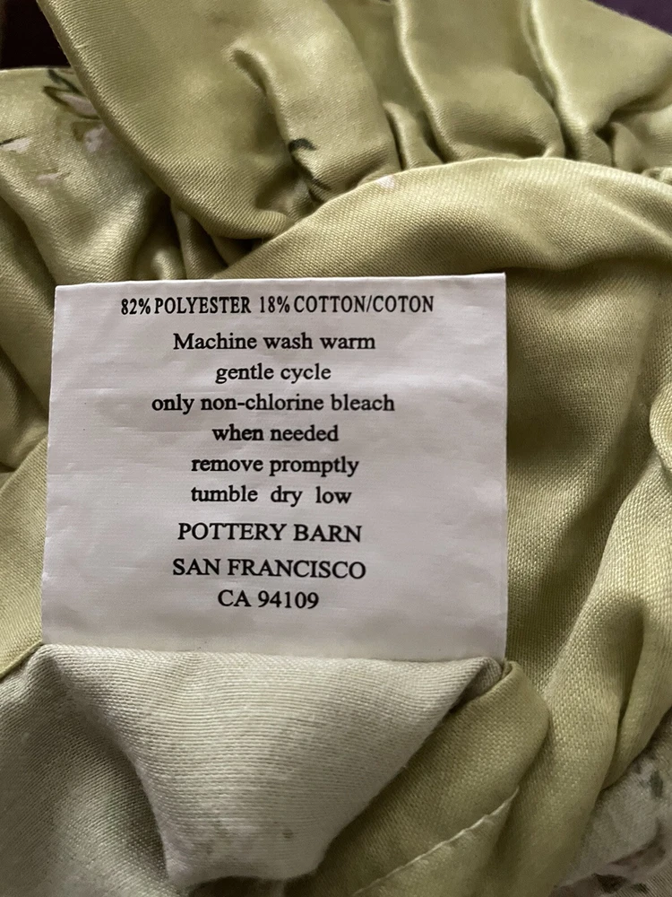 Pottery Barn b+b Green Floral Full Size Duvet Cover + 2 Ruffle Pillow Shams 3 Pc Polyester/ Cotton/ The material has a sateen look and feel. There is no size on the label/ Please refer to measurements for proper fit Approx. 84"x 83"/ Button closure/ Buttons are a little loose Pillow sham Approx.26"x19"/ Envelope closure There is a very tiny hole in the duvet and some light snags/ Please see last 2 photos Overall nice pre-owned condition Duvet and Shams have been freshly washed/ Will require iron or light steam Color may slightly vary due to camera lighting Smoke and Pet Free Home
